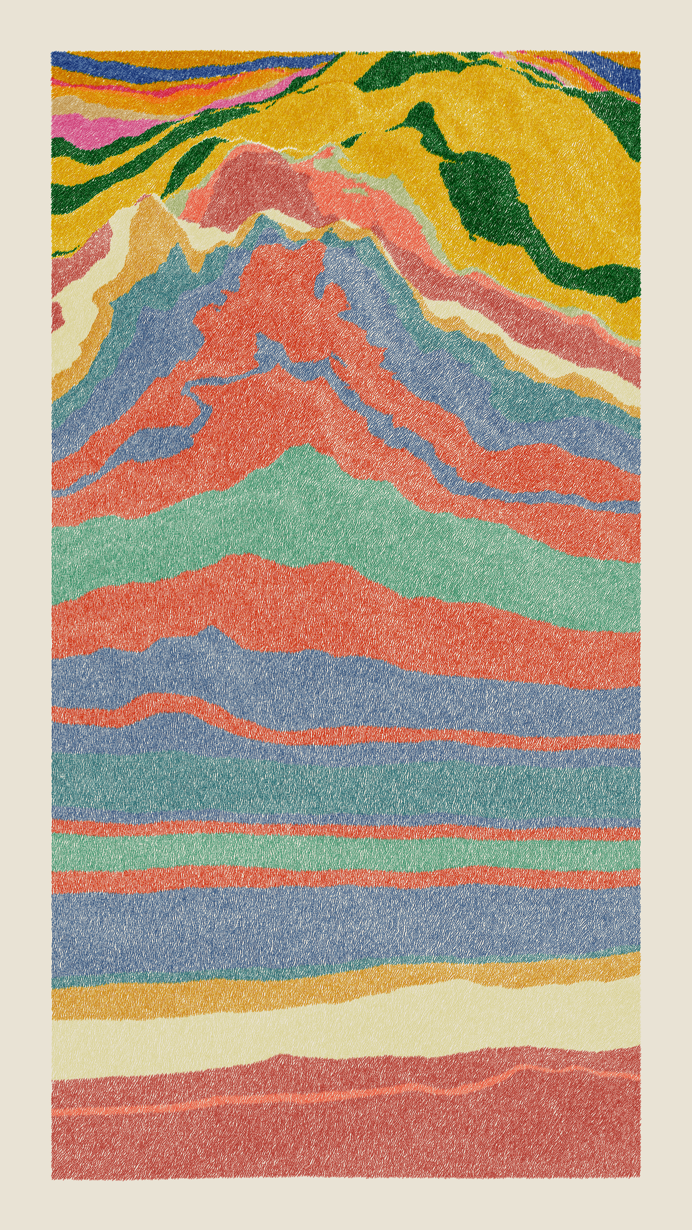 Stratified landforms constructed from many small strokes of colour. The hash of each token describes a coordinate within a multidimensional generative space, locating a unique composition that lies along one of many possible longitudes.