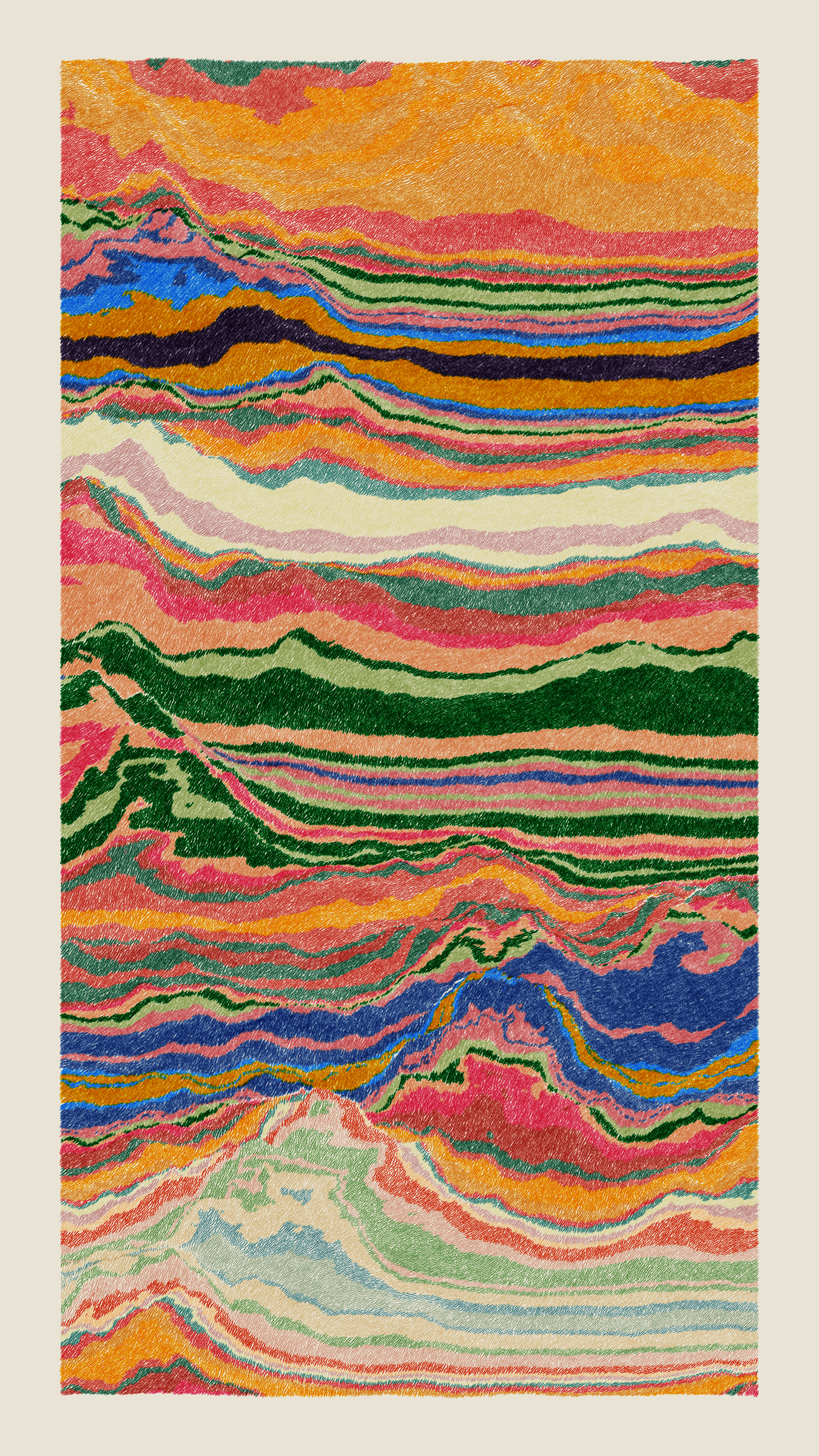 Stratified landforms constructed from many small strokes of colour. The hash of each token describes a coordinate within a multidimensional generative space, locating a unique composition that lies along one of many possible longitudes.