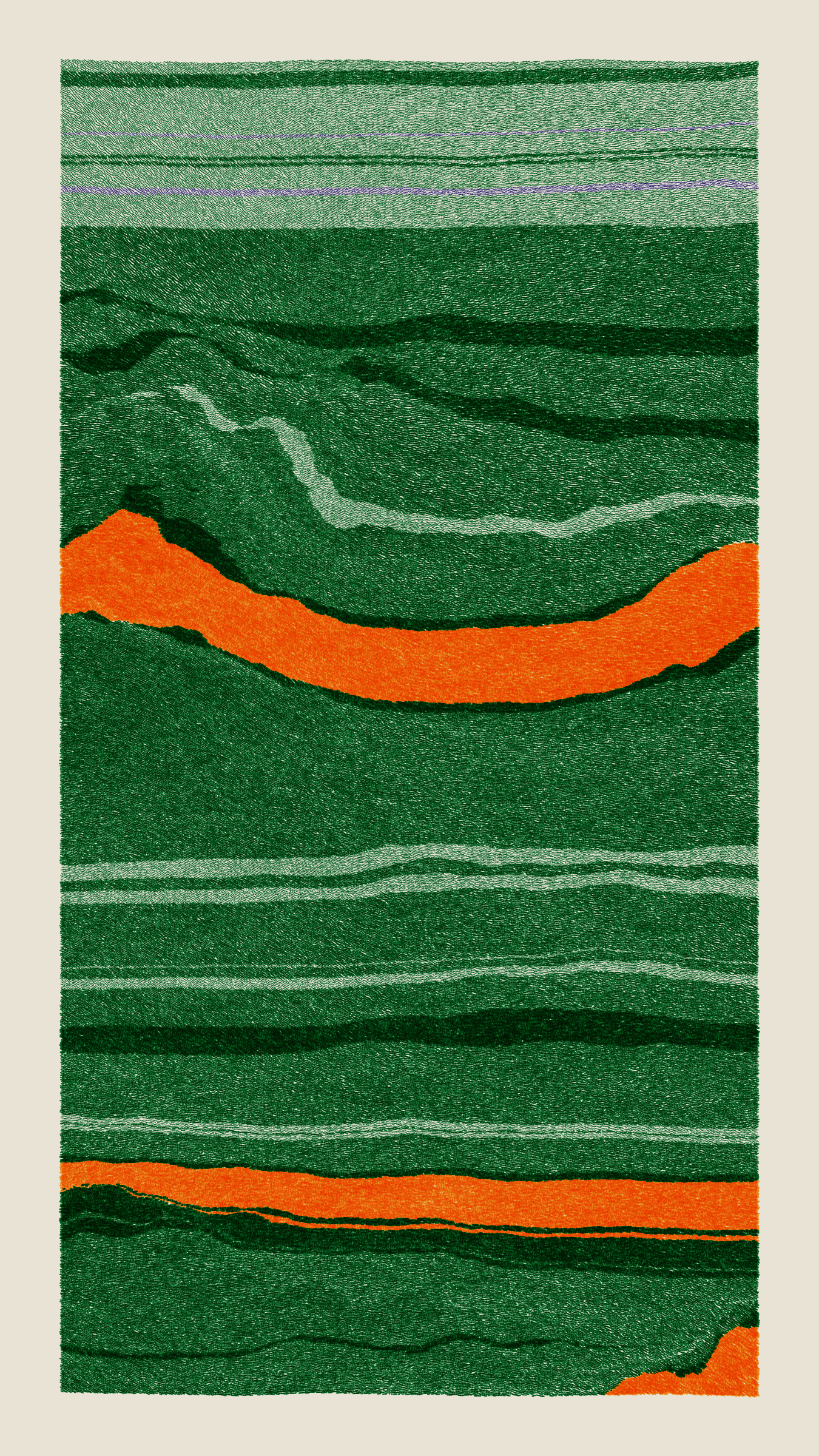 Stratified landforms constructed from many small strokes of colour. The hash of each token describes a coordinate within a multidimensional generative space, locating a unique composition that lies along one of many possible longitudes.