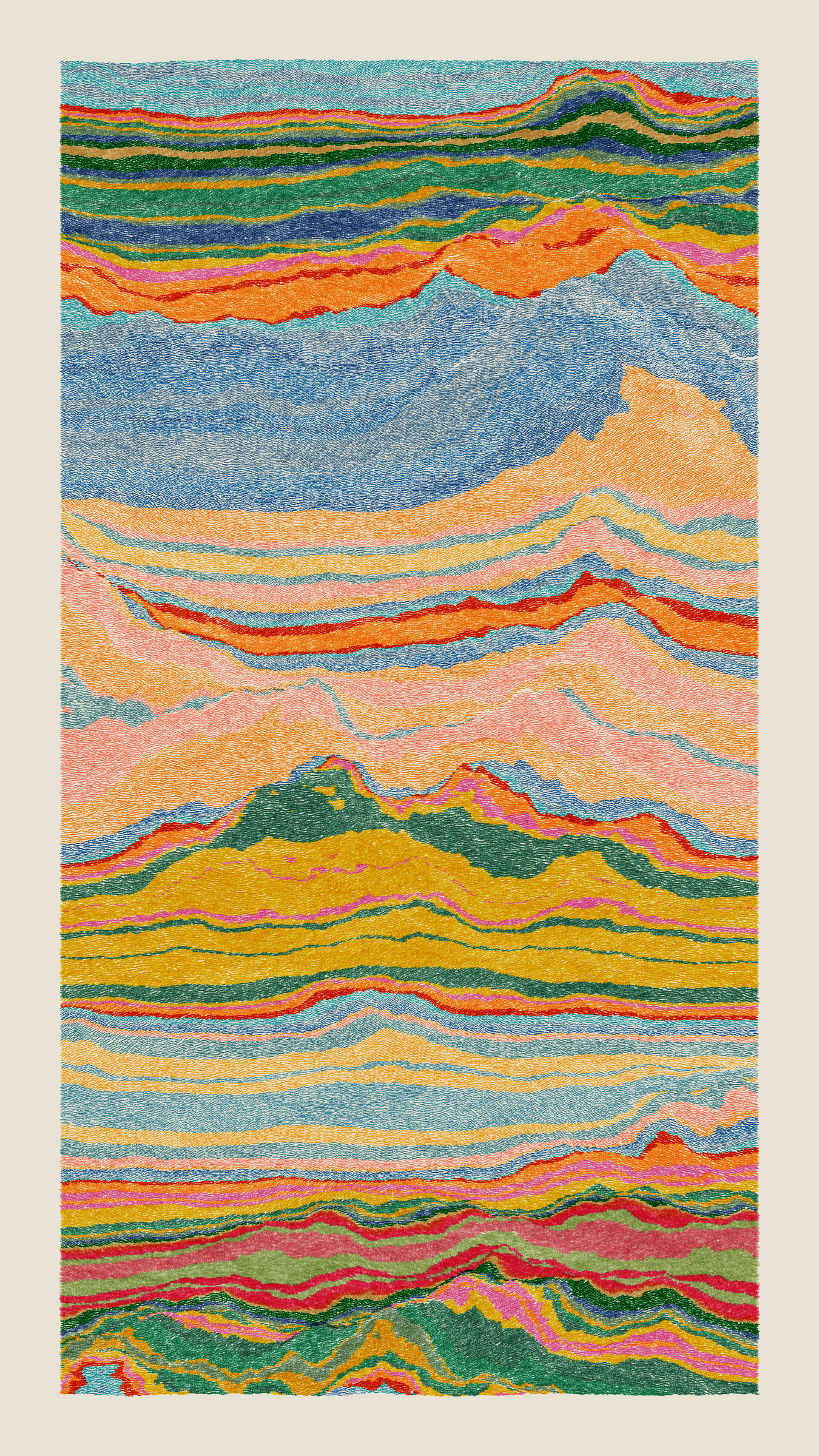 Stratified landforms constructed from many small strokes of colour. The hash of each token describes a coordinate within a multidimensional generative space, locating a unique composition that lies along one of many possible longitudes.