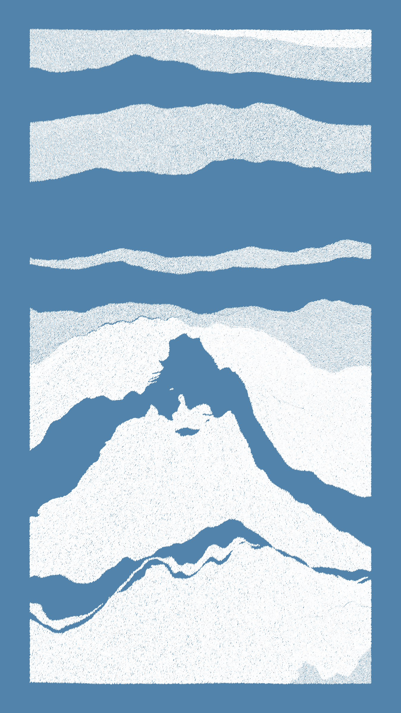 Stratified landforms constructed from many small strokes of colour. The hash of each token describes a coordinate within a multidimensional generative space, locating a unique composition that lies along one of many possible longitudes.