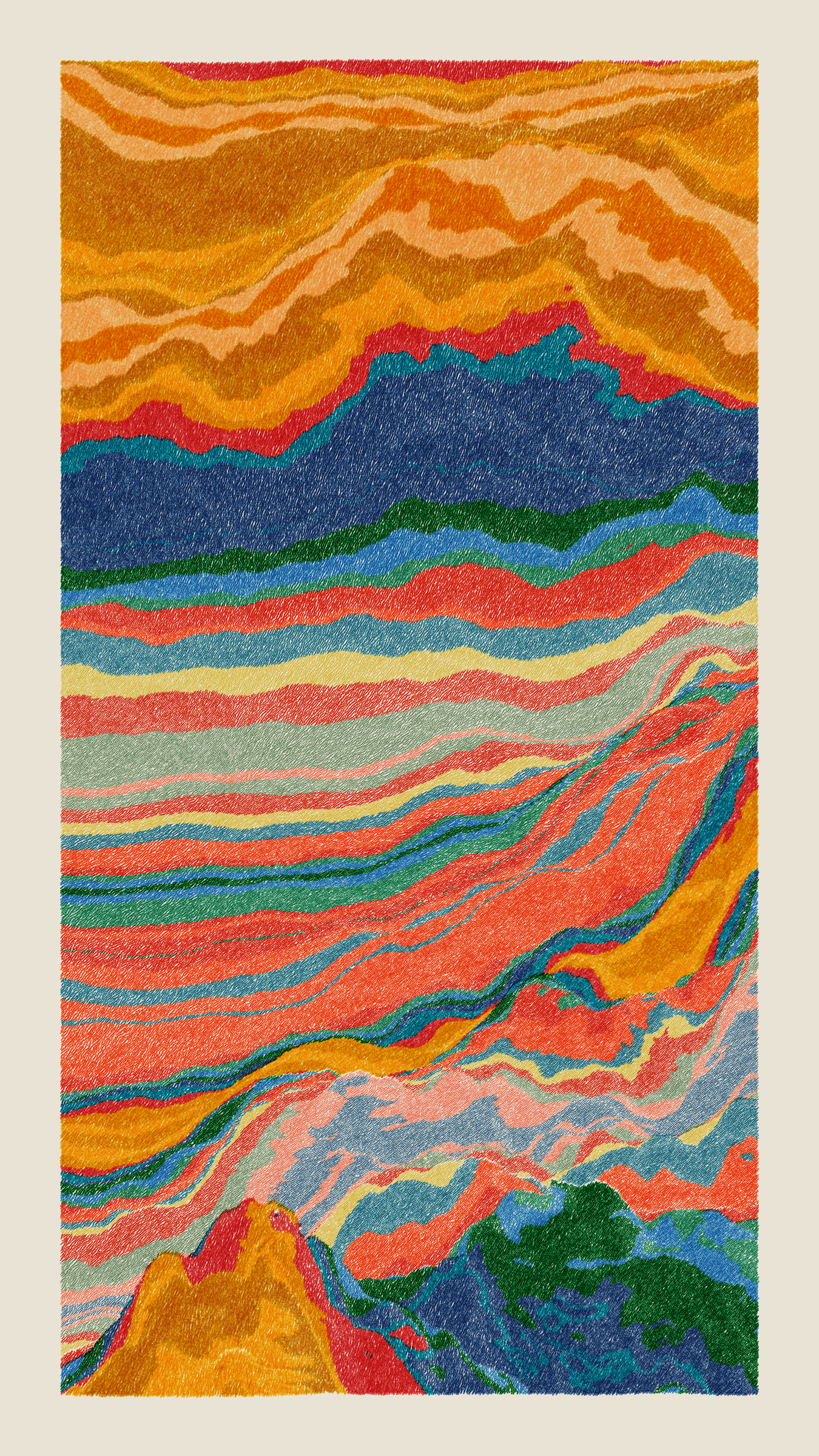 Stratified landforms constructed from many small strokes of colour. The hash of each token describes a coordinate within a multidimensional generative space, locating a unique composition that lies along one of many possible longitudes.