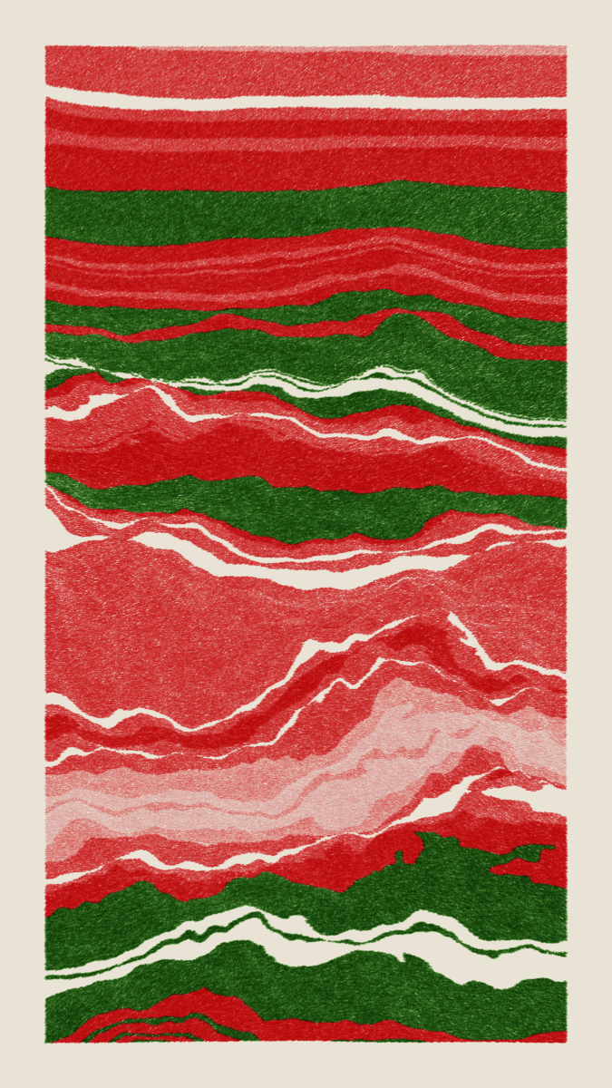 Stratified landforms constructed from many small strokes of colour. The hash of each token describes a coordinate within a multidimensional generative space, locating a unique composition that lies along one of many possible longitudes.