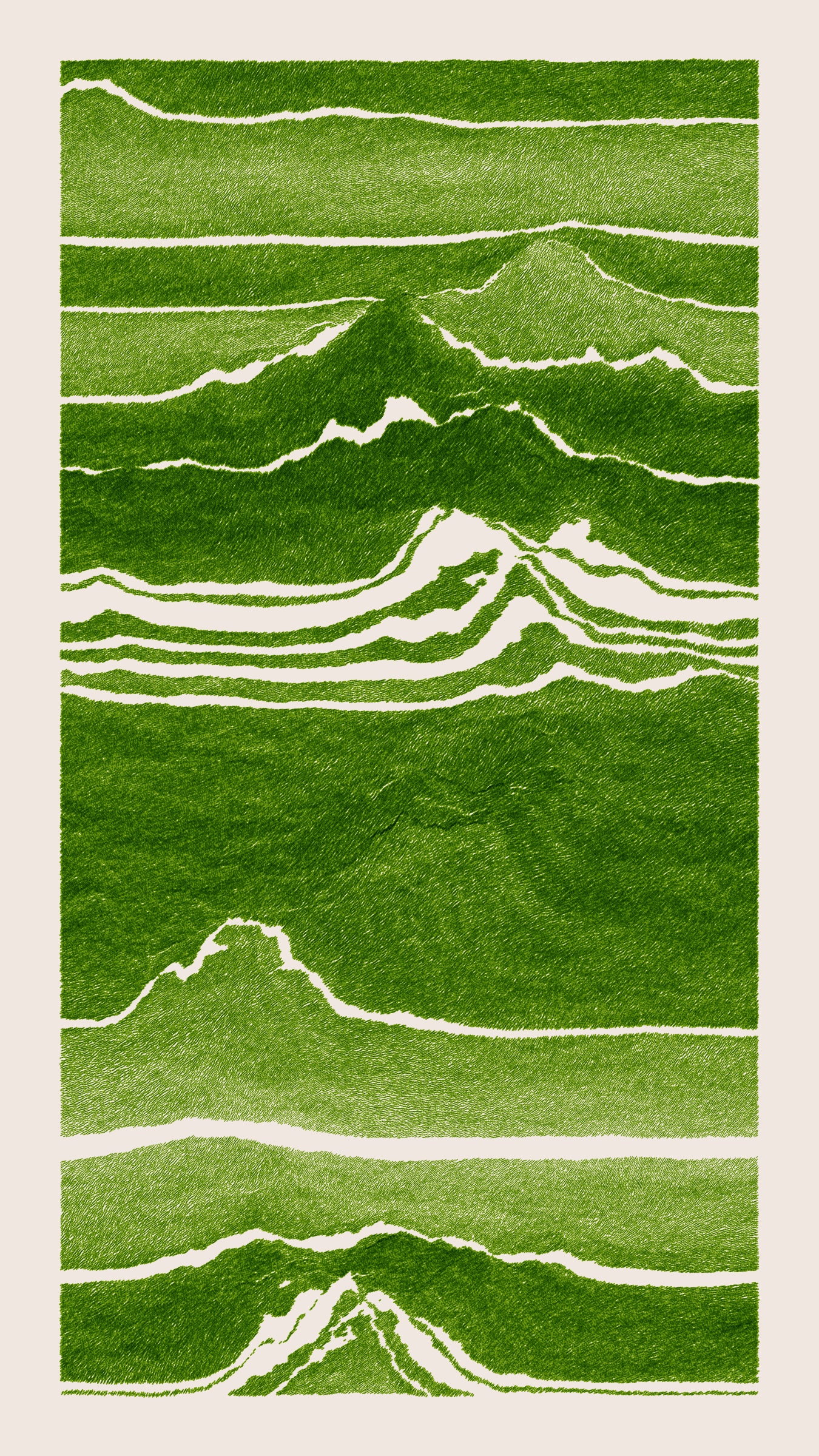 Stratified landforms constructed from many small strokes of colour. The hash of each token describes a coordinate within a multidimensional generative space, locating a unique composition that lies along one of many possible longitudes.