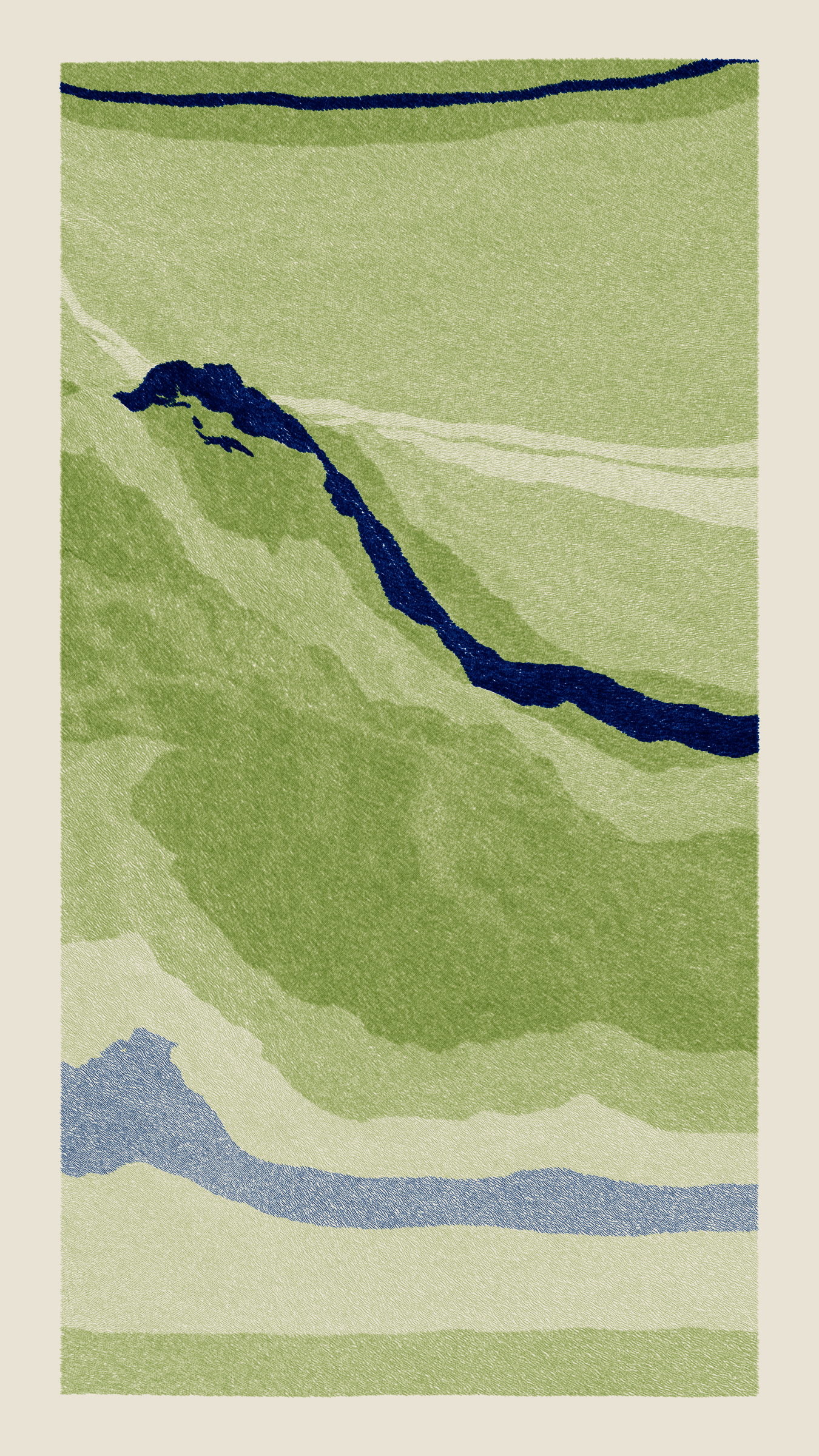 Stratified landforms constructed from many small strokes of colour. The hash of each token describes a coordinate within a multidimensional generative space, locating a unique composition that lies along one of many possible longitudes.