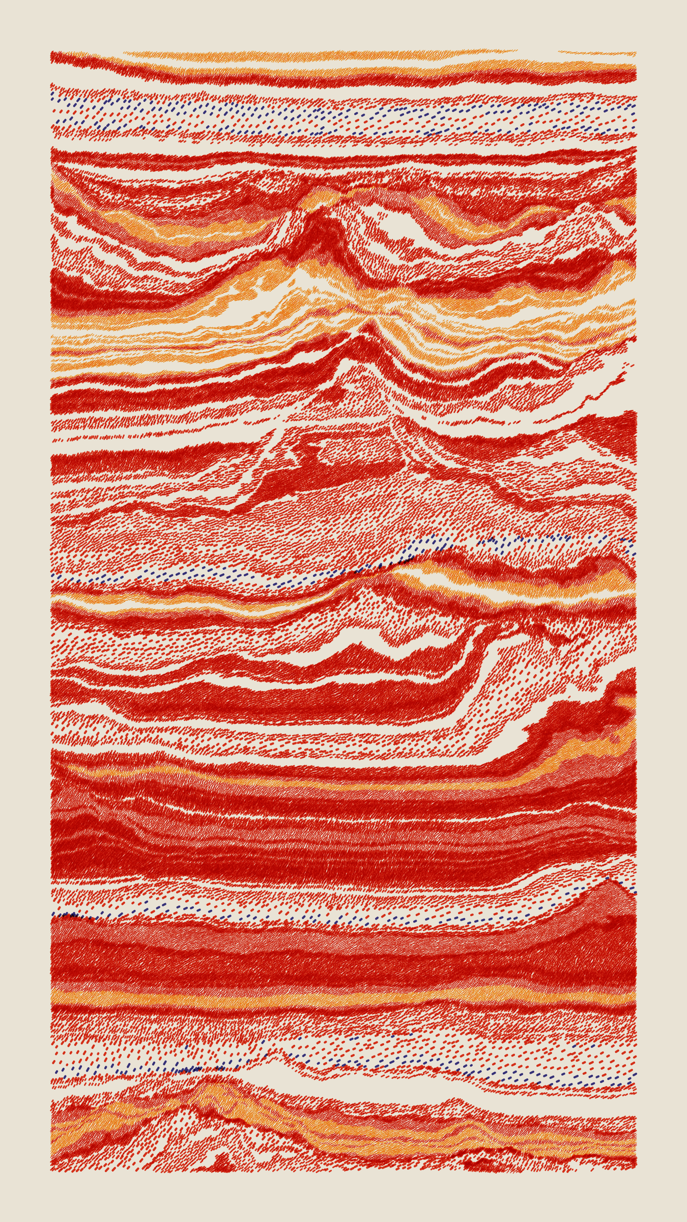 Stratified landforms constructed from many small strokes of colour. The hash of each token describes a coordinate within a multidimensional generative space, locating a unique composition that lies along one of many possible longitudes.