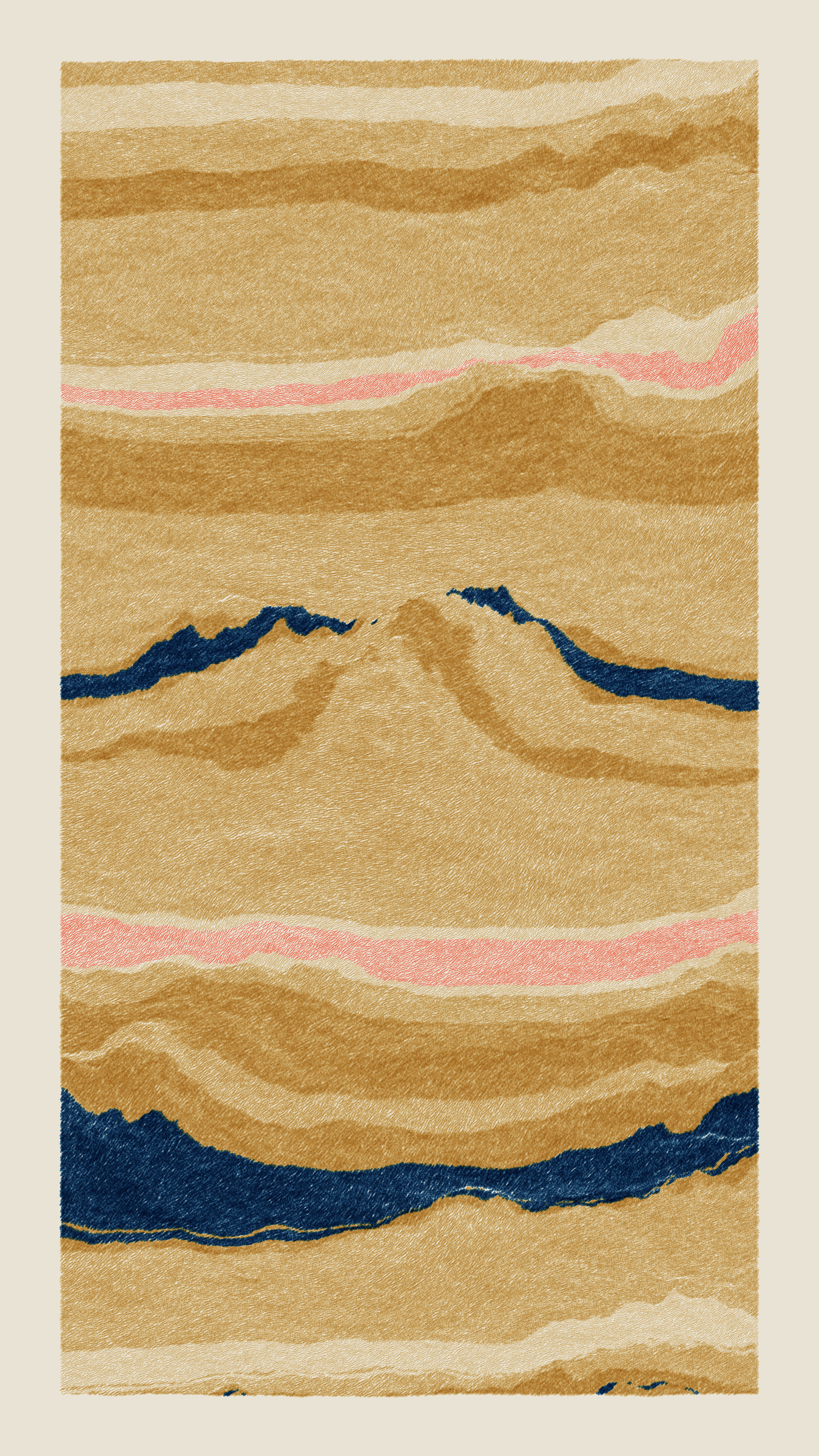 Stratified landforms constructed from many small strokes of colour. The hash of each token describes a coordinate within a multidimensional generative space, locating a unique composition that lies along one of many possible longitudes.
