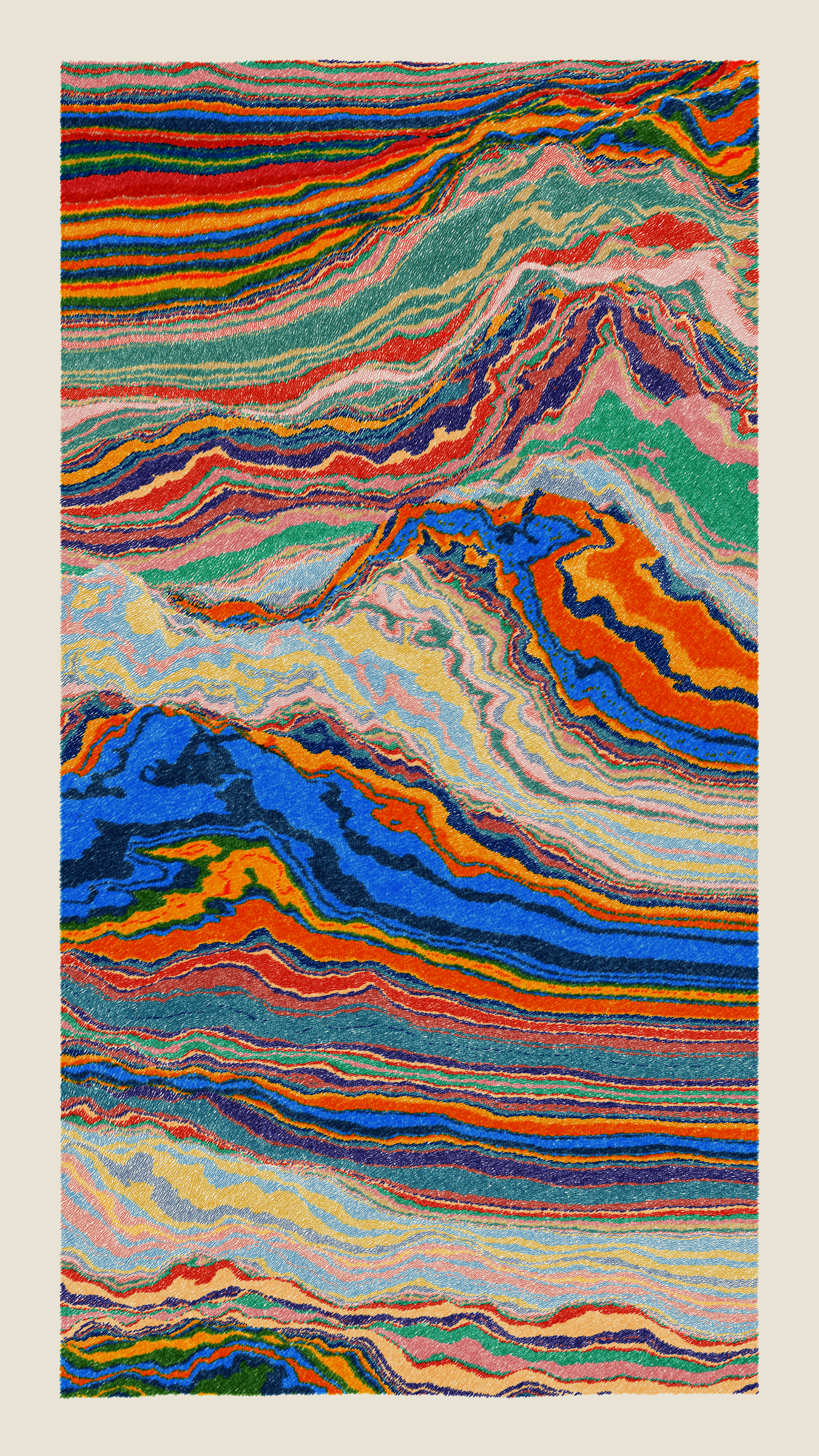 Stratified landforms constructed from many small strokes of colour. The hash of each token describes a coordinate within a multidimensional generative space, locating a unique composition that lies along one of many possible longitudes.