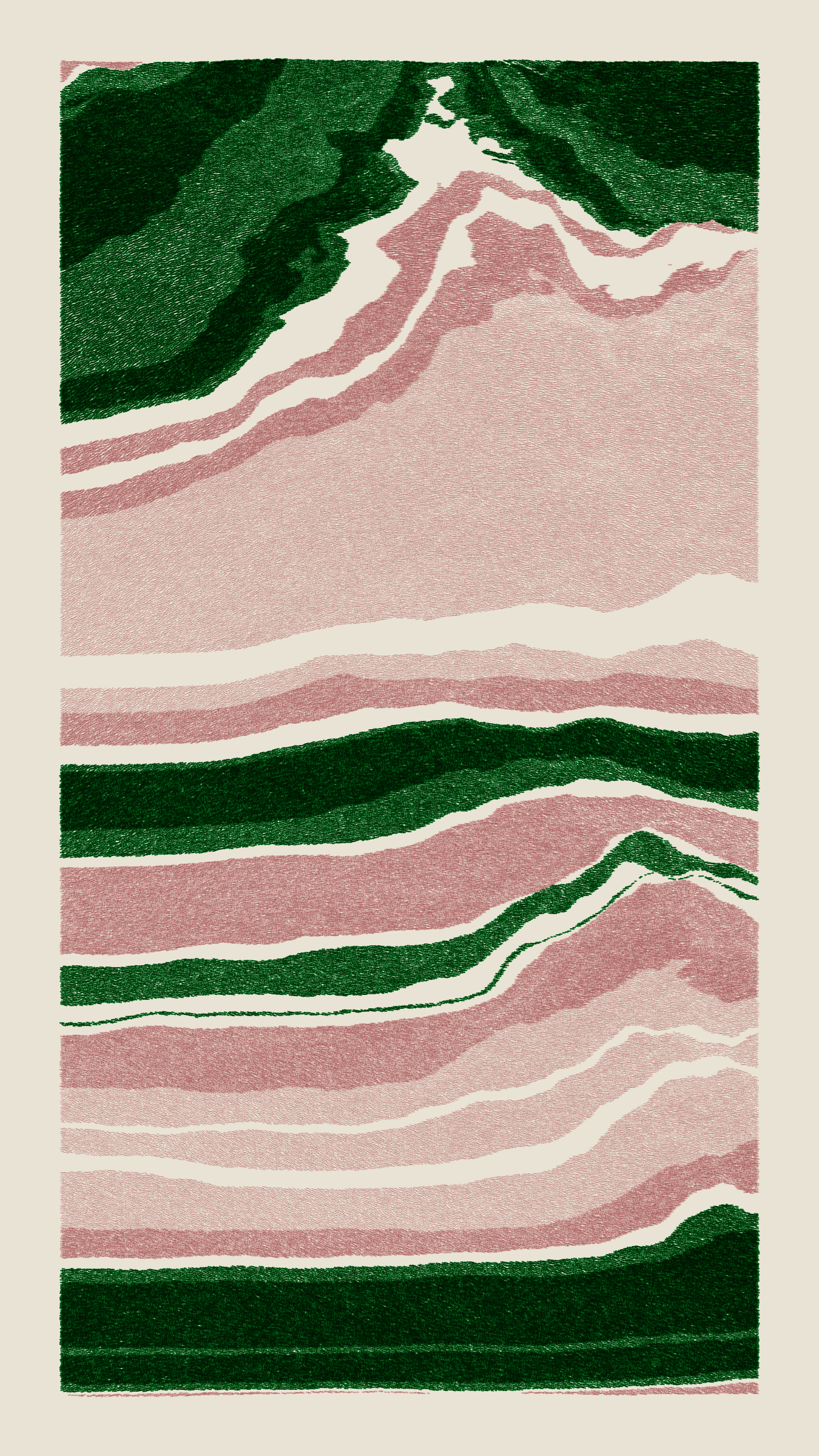 Stratified landforms constructed from many small strokes of colour. The hash of each token describes a coordinate within a multidimensional generative space, locating a unique composition that lies along one of many possible longitudes.
