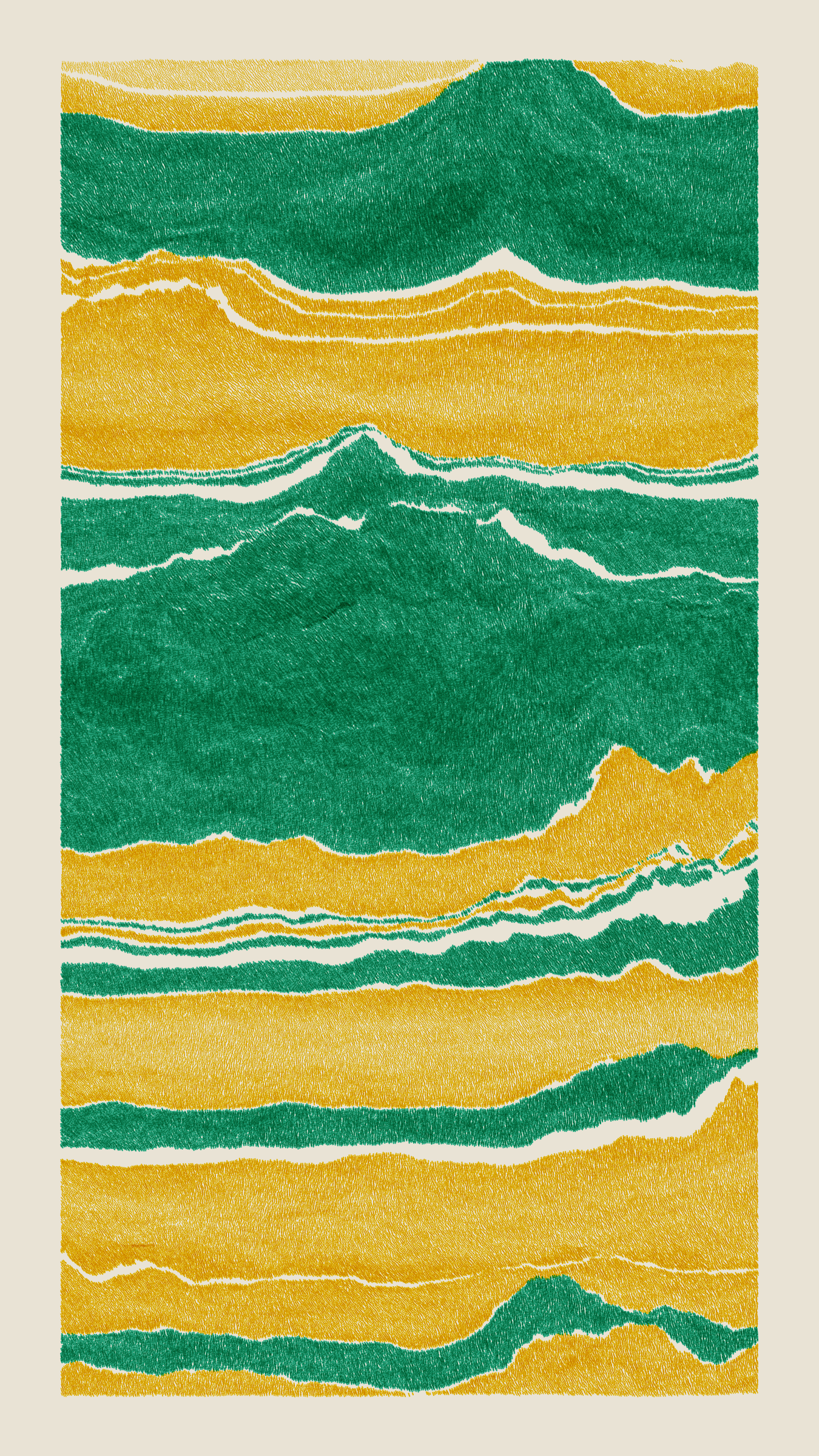 Stratified landforms constructed from many small strokes of colour. The hash of each token describes a coordinate within a multidimensional generative space, locating a unique composition that lies along one of many possible longitudes.
