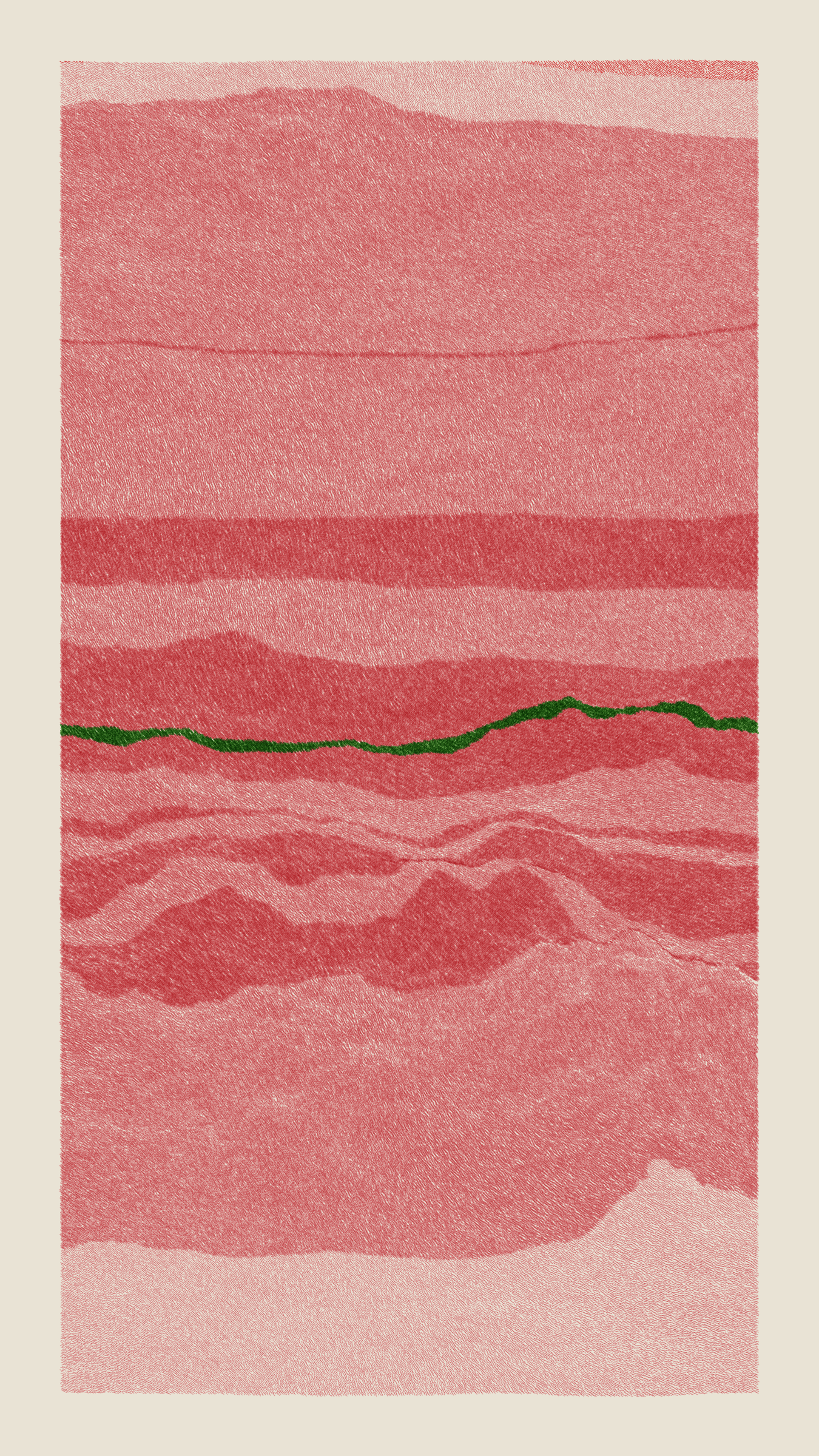 Stratified landforms constructed from many small strokes of colour. The hash of each token describes a coordinate within a multidimensional generative space, locating a unique composition that lies along one of many possible longitudes.
