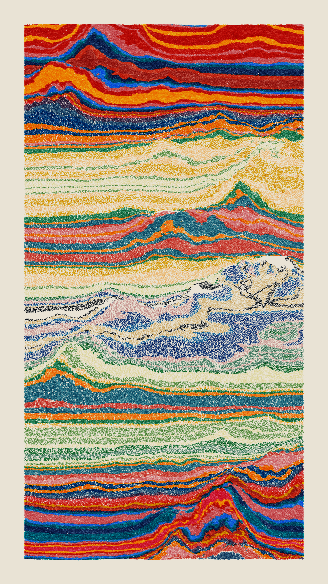 Stratified landforms constructed from many small strokes of colour. The hash of each token describes a coordinate within a multidimensional generative space, locating a unique composition that lies along one of many possible longitudes.