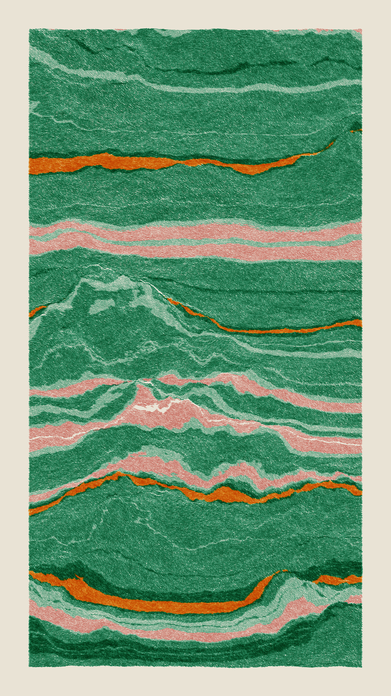 Stratified landforms constructed from many small strokes of colour. The hash of each token describes a coordinate within a multidimensional generative space, locating a unique composition that lies along one of many possible longitudes.