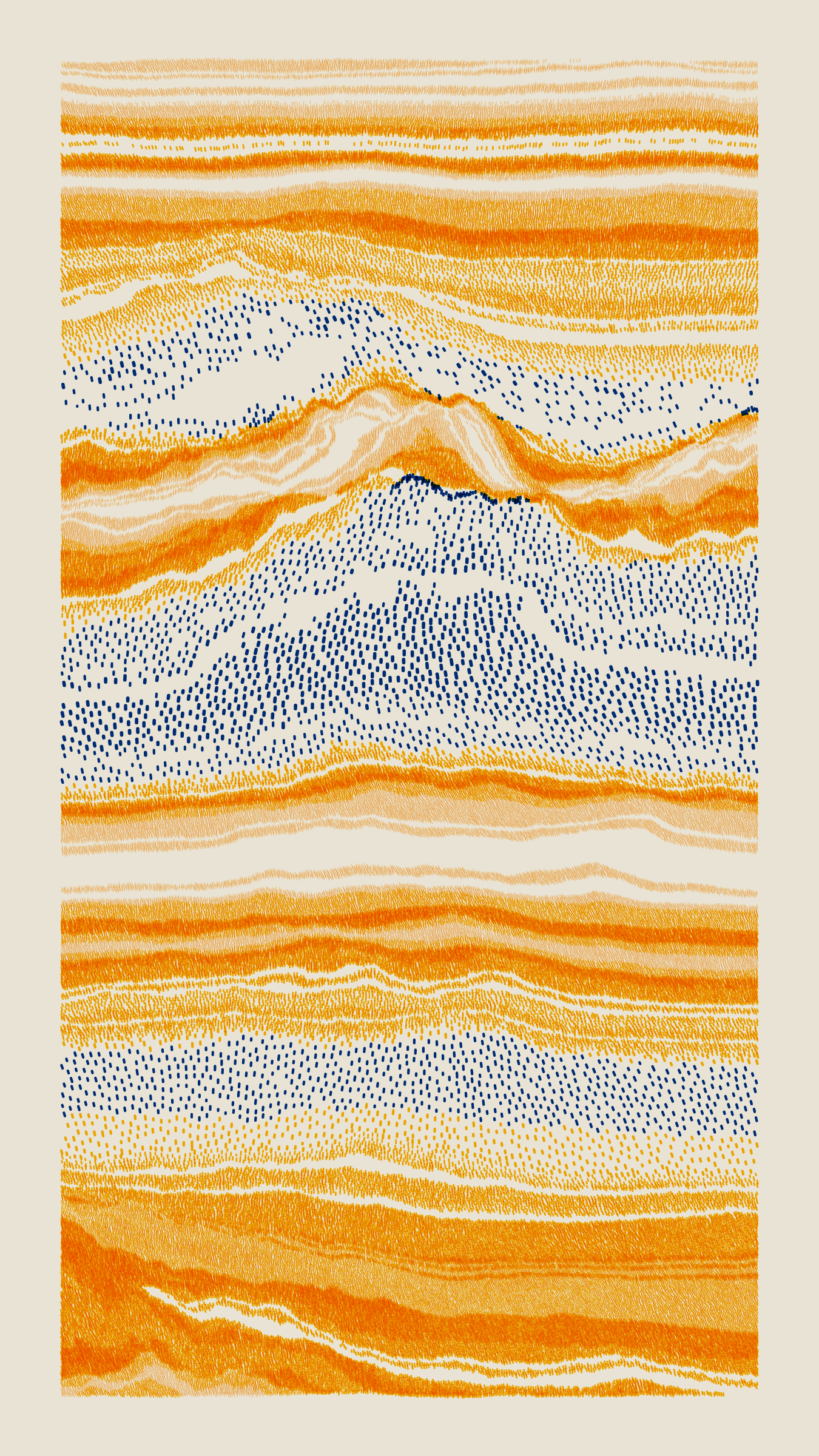 Stratified landforms constructed from many small strokes of colour. The hash of each token describes a coordinate within a multidimensional generative space, locating a unique composition that lies along one of many possible longitudes.