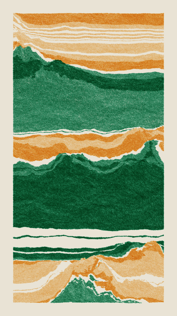 Stratified landforms constructed from many small strokes of colour. The hash of each token describes a coordinate within a multidimensional generative space, locating a unique composition that lies along one of many possible longitudes.