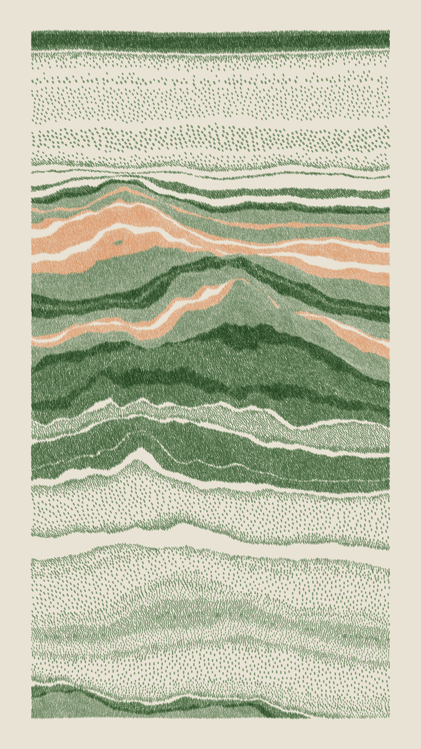 Stratified landforms constructed from many small strokes of colour. The hash of each token describes a coordinate within a multidimensional generative space, locating a unique composition that lies along one of many possible longitudes.