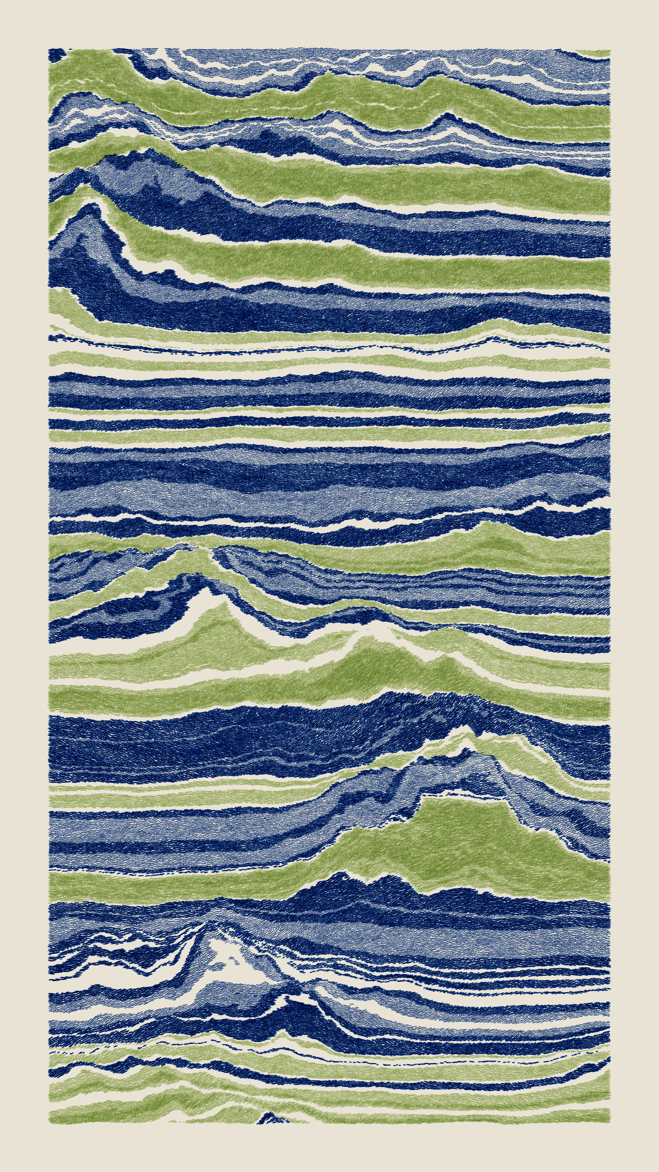 Stratified landforms constructed from many small strokes of colour. The hash of each token describes a coordinate within a multidimensional generative space, locating a unique composition that lies along one of many possible longitudes.