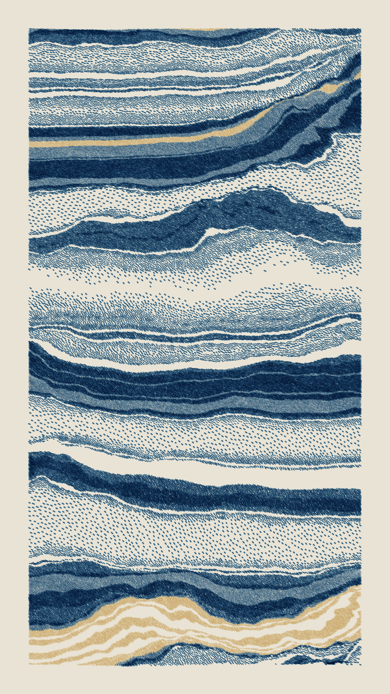 Stratified landforms constructed from many small strokes of colour. The hash of each token describes a coordinate within a multidimensional generative space, locating a unique composition that lies along one of many possible longitudes.