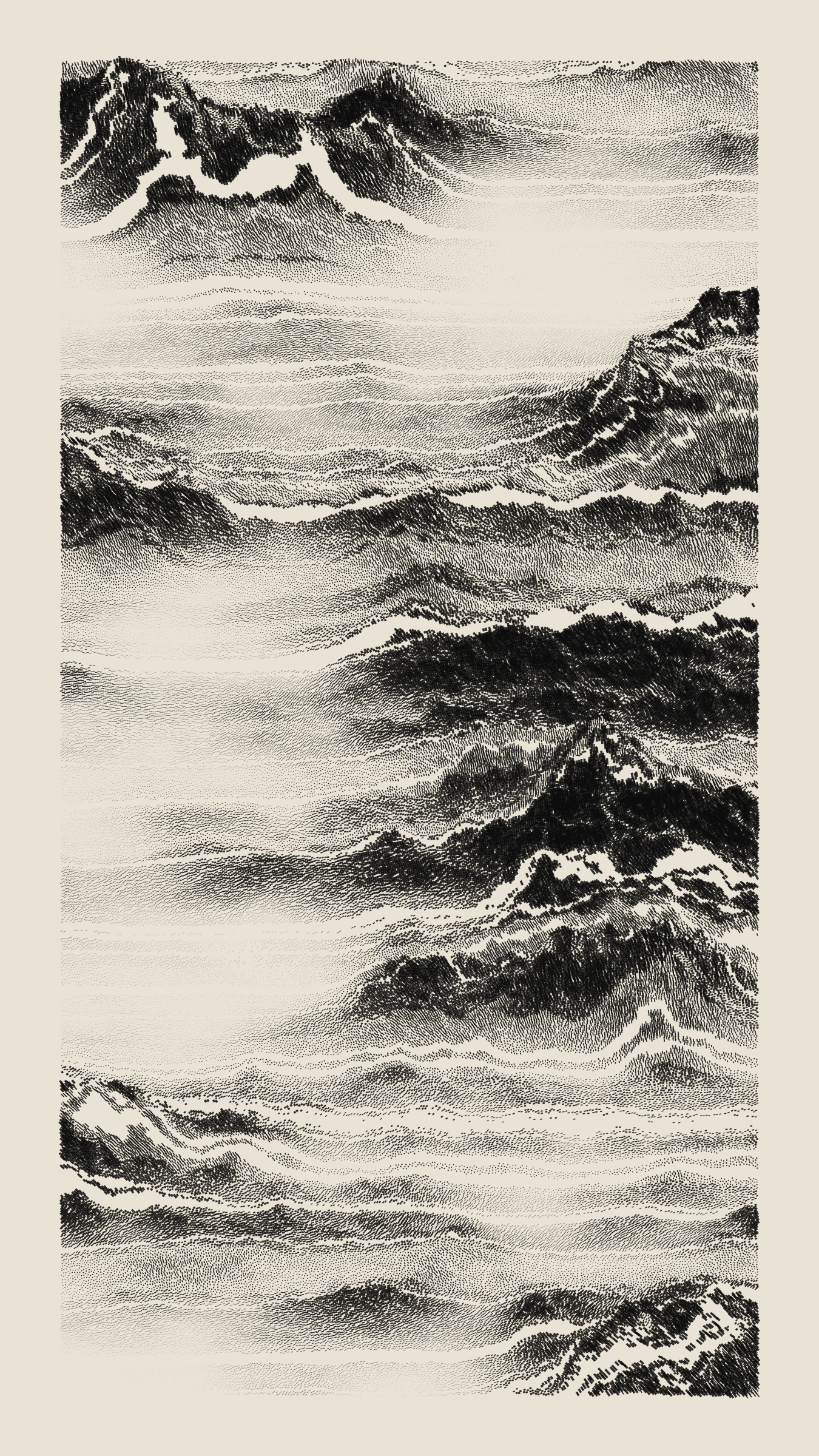 Stratified landforms constructed from many small strokes of colour. The hash of each token describes a coordinate within a multidimensional generative space, locating a unique composition that lies along one of many possible longitudes.