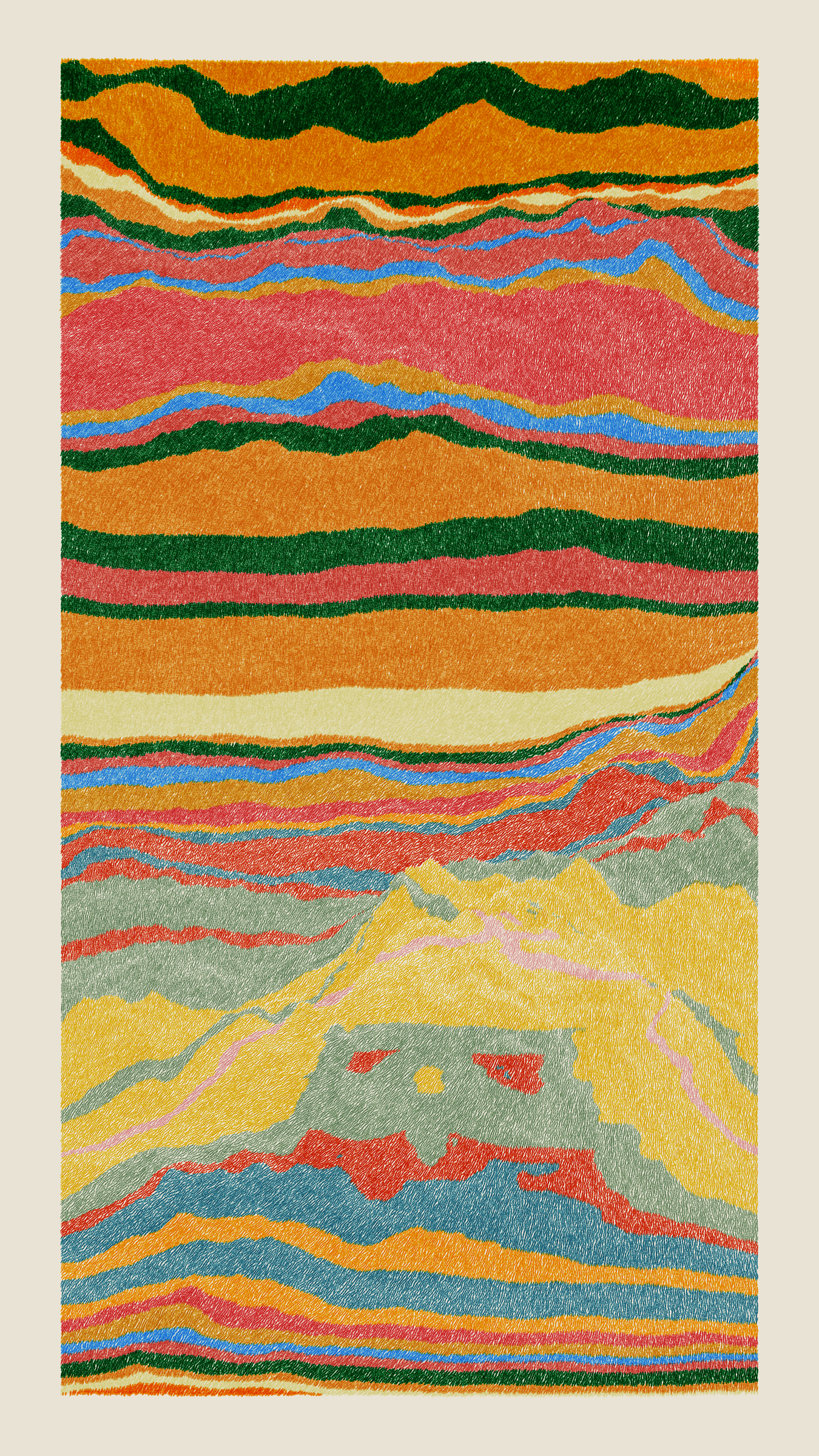 Stratified landforms constructed from many small strokes of colour. The hash of each token describes a coordinate within a multidimensional generative space, locating a unique composition that lies along one of many possible longitudes.
