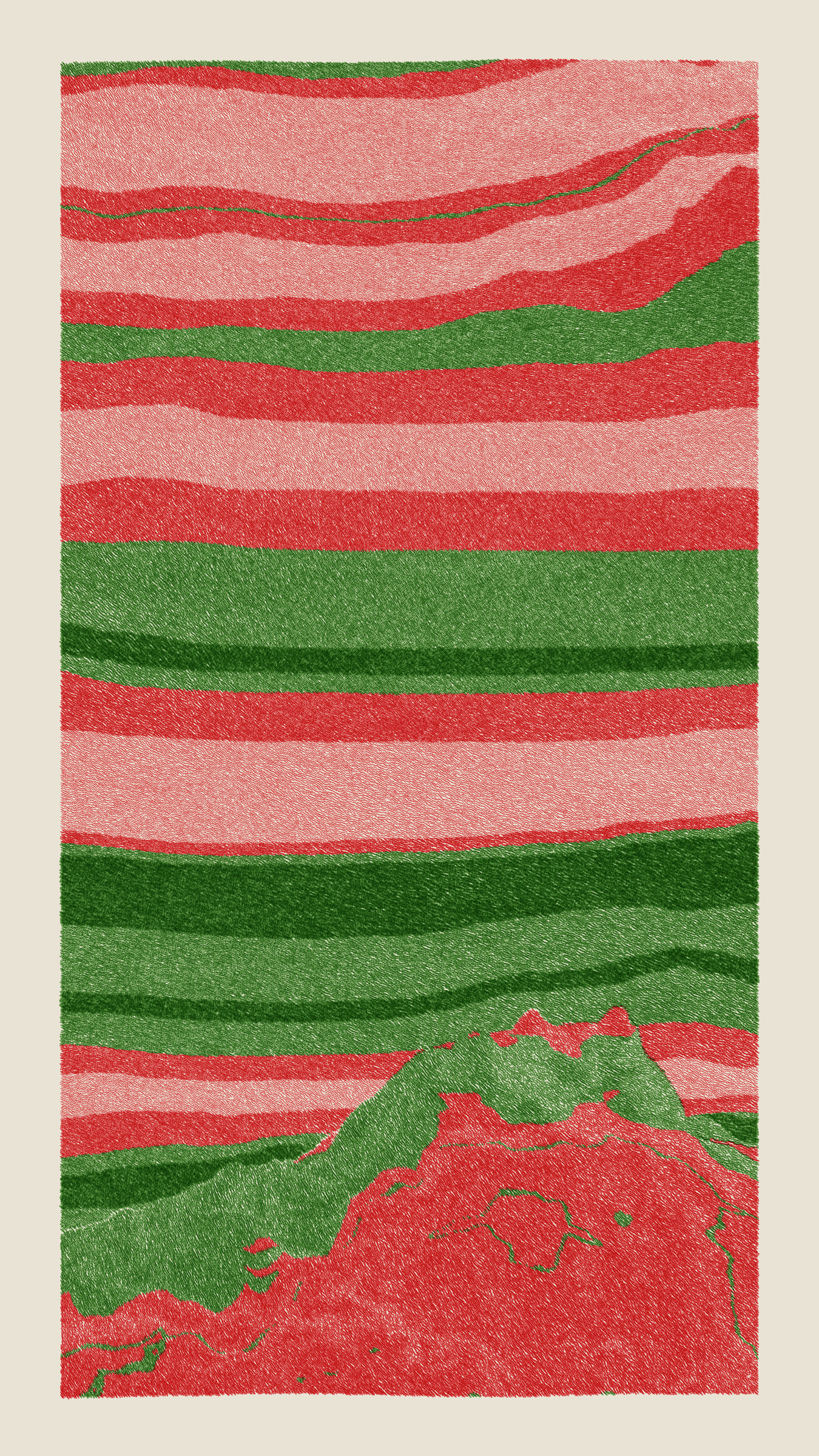 Stratified landforms constructed from many small strokes of colour. The hash of each token describes a coordinate within a multidimensional generative space, locating a unique composition that lies along one of many possible longitudes.