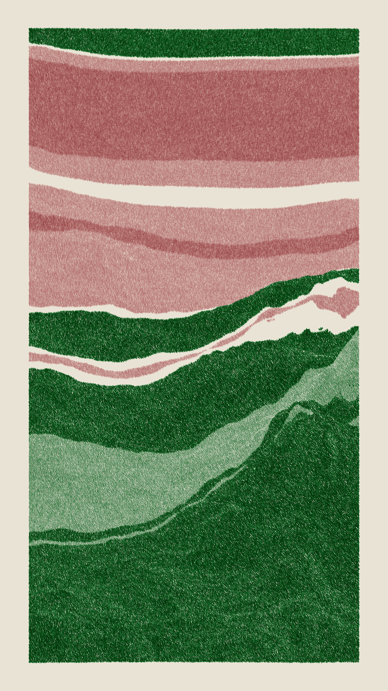 Stratified landforms constructed from many small strokes of colour. The hash of each token describes a coordinate within a multidimensional generative space, locating a unique composition that lies along one of many possible longitudes.
