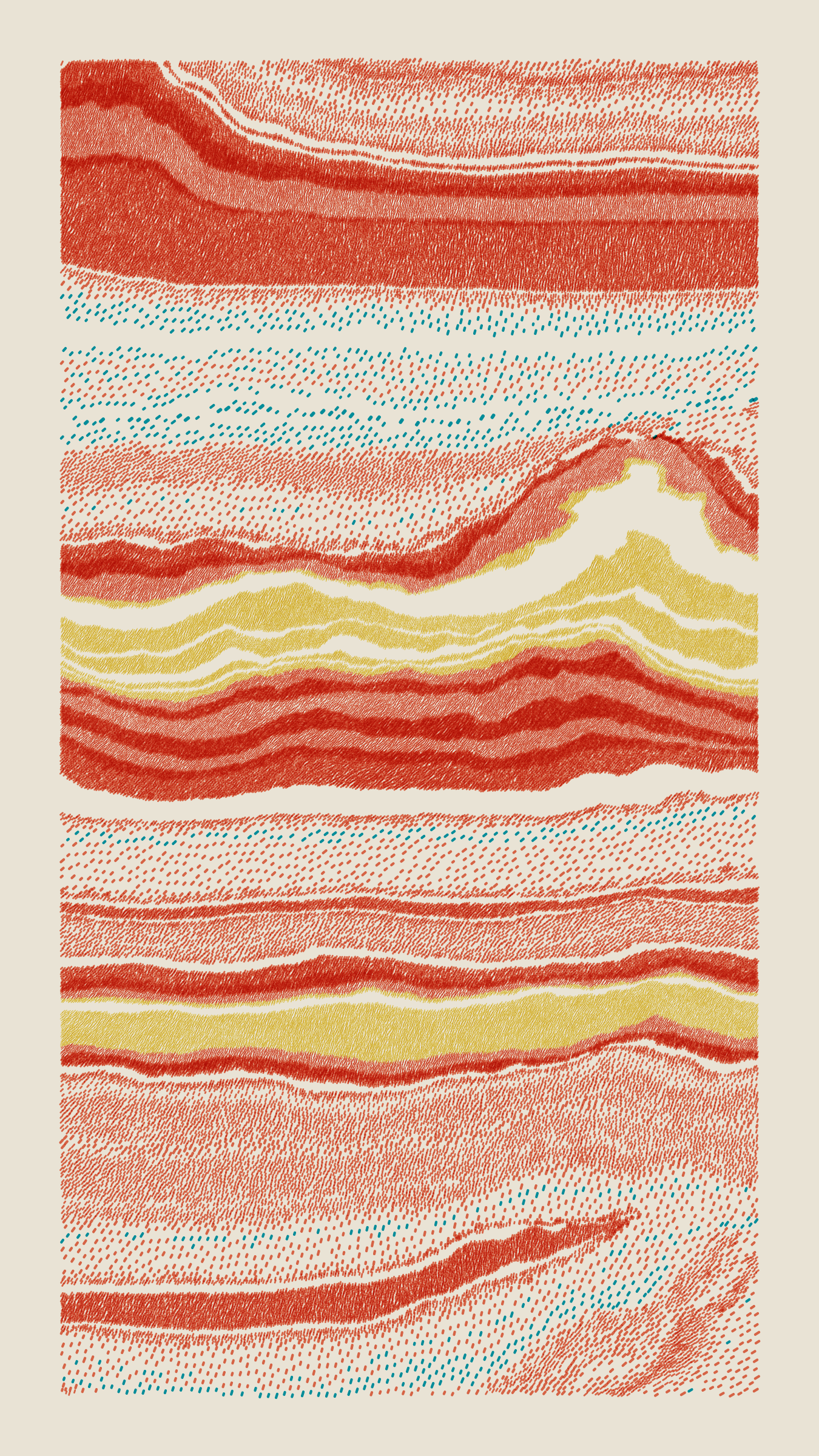Stratified landforms constructed from many small strokes of colour. The hash of each token describes a coordinate within a multidimensional generative space, locating a unique composition that lies along one of many possible longitudes.