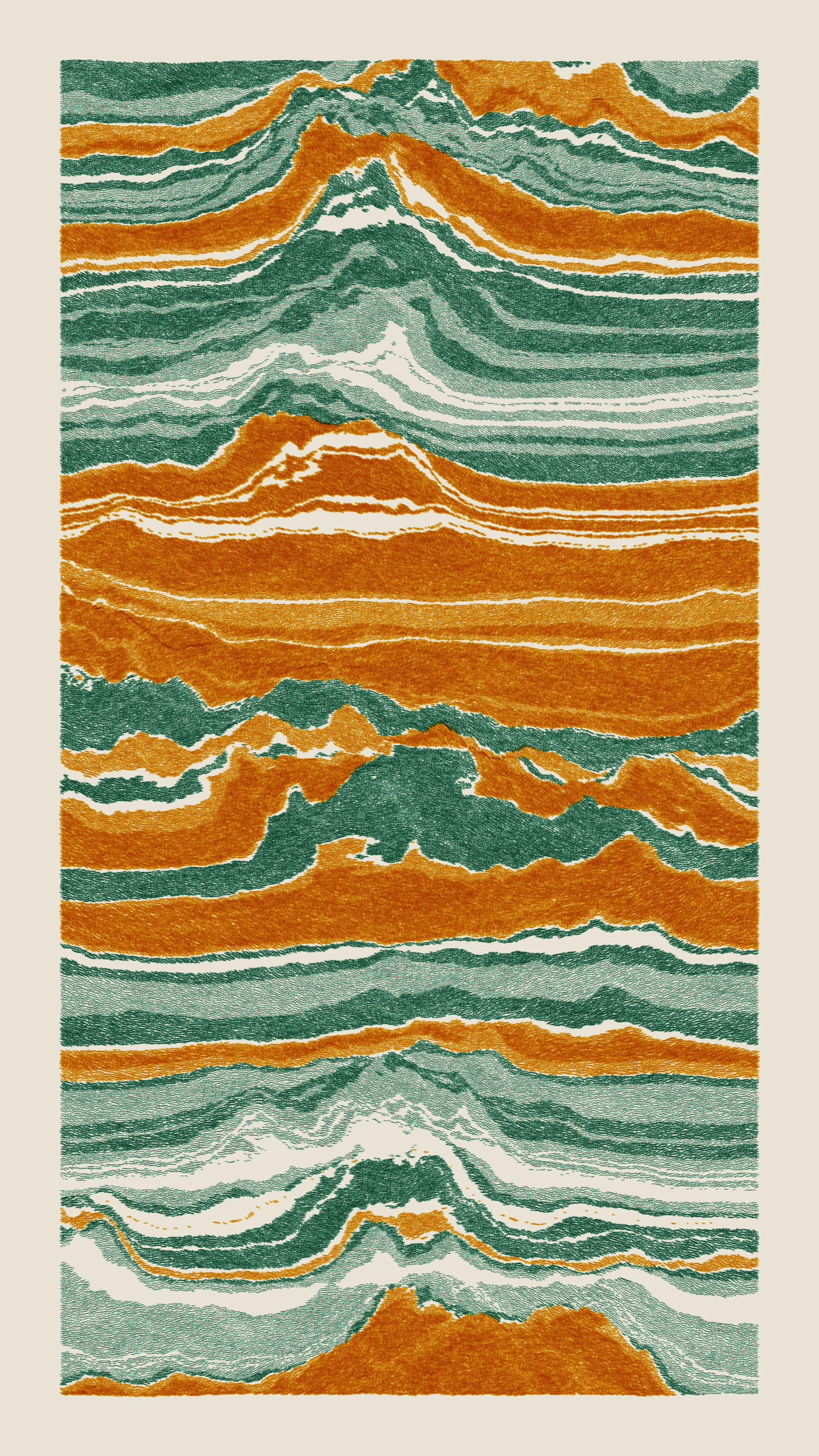 Stratified landforms constructed from many small strokes of colour. The hash of each token describes a coordinate within a multidimensional generative space, locating a unique composition that lies along one of many possible longitudes.