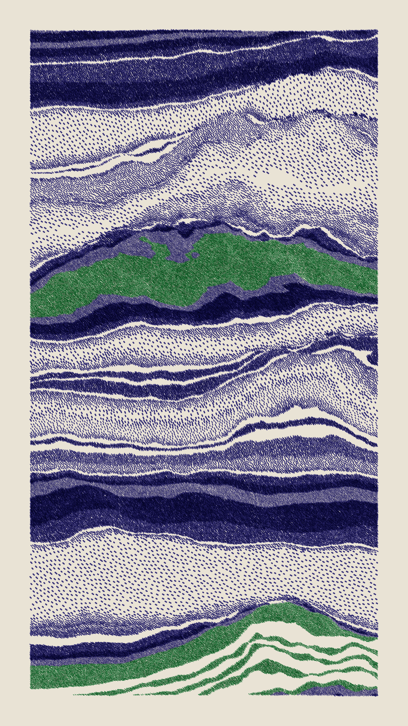 Stratified landforms constructed from many small strokes of colour. The hash of each token describes a coordinate within a multidimensional generative space, locating a unique composition that lies along one of many possible longitudes.