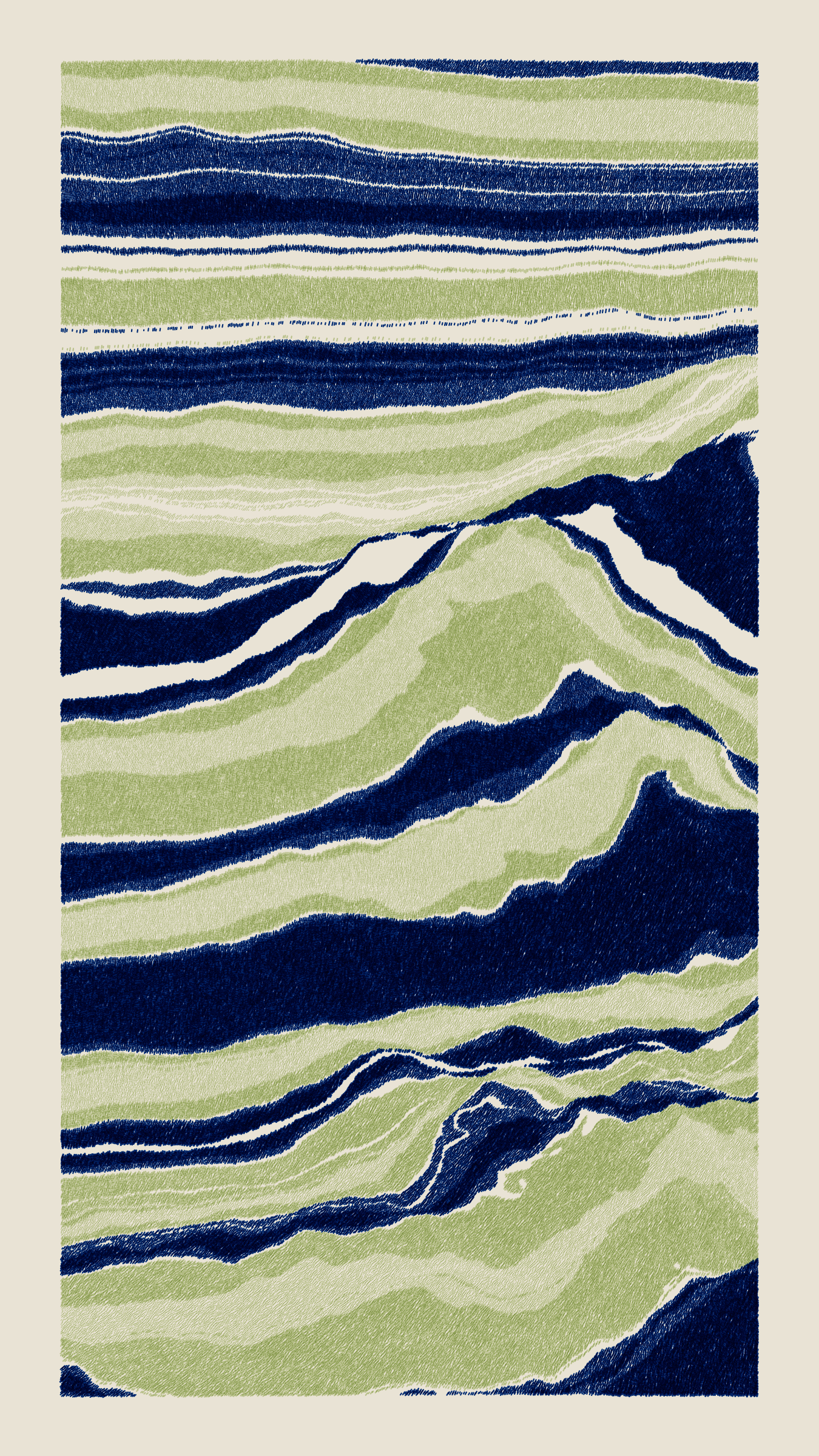 Stratified landforms constructed from many small strokes of colour. The hash of each token describes a coordinate within a multidimensional generative space, locating a unique composition that lies along one of many possible longitudes.