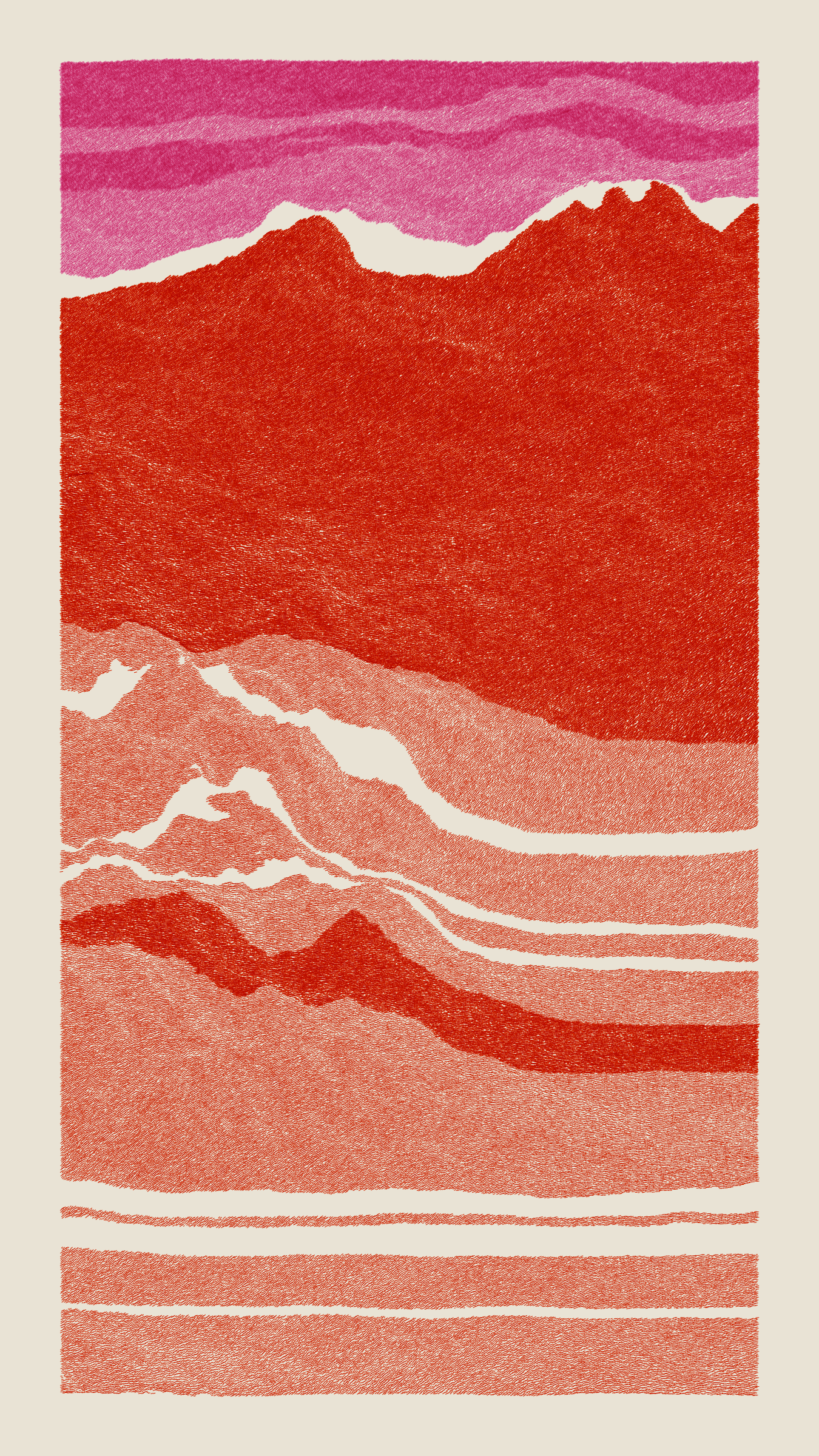 Stratified landforms constructed from many small strokes of colour. The hash of each token describes a coordinate within a multidimensional generative space, locating a unique composition that lies along one of many possible longitudes.