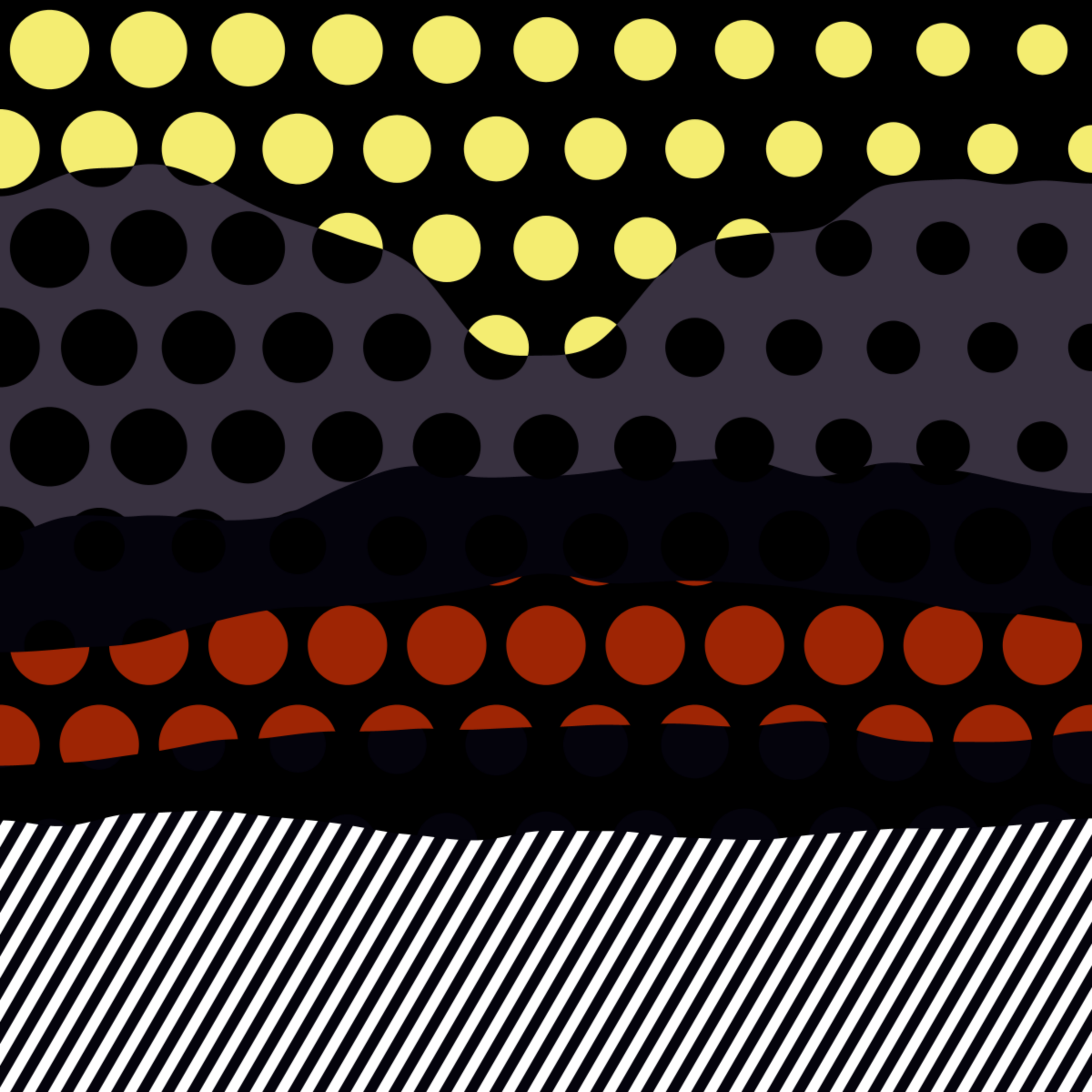 An ode to Roy Lichtenstein, incorporating his iconic version of Ben-Day dots, halftone dots, angled stripes, and solid color patches. Inspired by Roy's sea and landscape paintings, each artwork generates a unique combination of patterns, shapes, and colors.