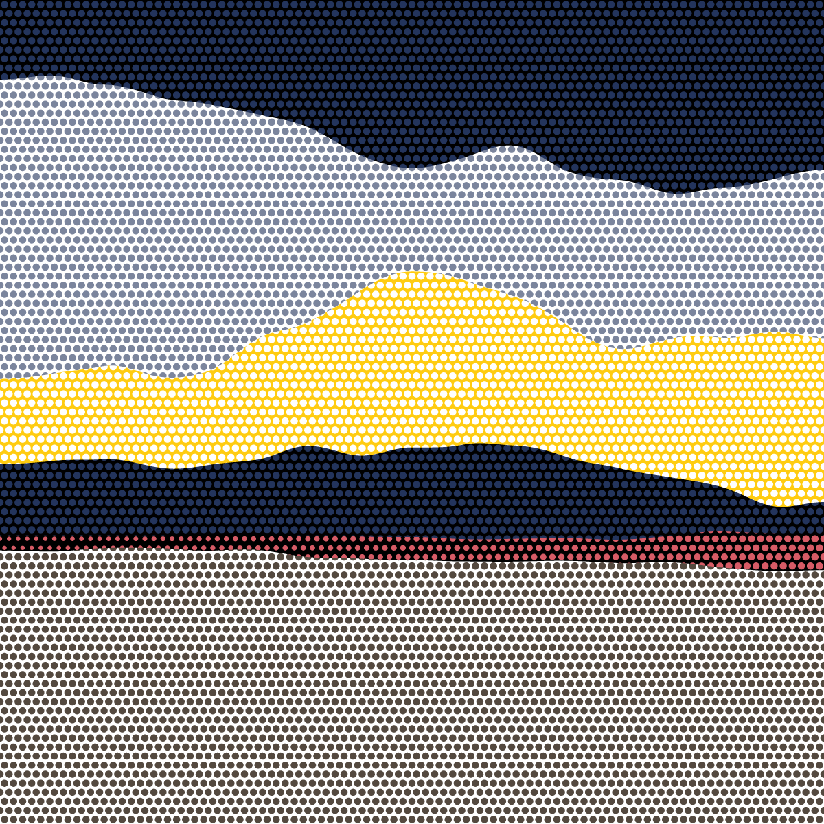 An ode to Roy Lichtenstein, incorporating his iconic version of Ben-Day dots, halftone dots, angled stripes, and solid color patches. Inspired by Roy's sea and landscape paintings, each artwork generates a unique combination of patterns, shapes, and colors.