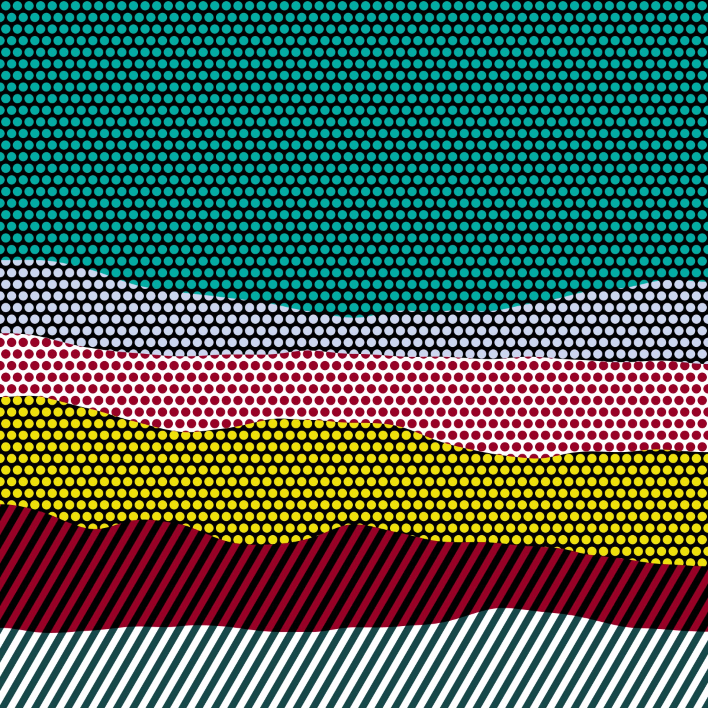 An ode to Roy Lichtenstein, incorporating his iconic version of Ben-Day dots, halftone dots, angled stripes, and solid color patches. Inspired by Roy's sea and landscape paintings, each artwork generates a unique combination of patterns, shapes, and colors.
