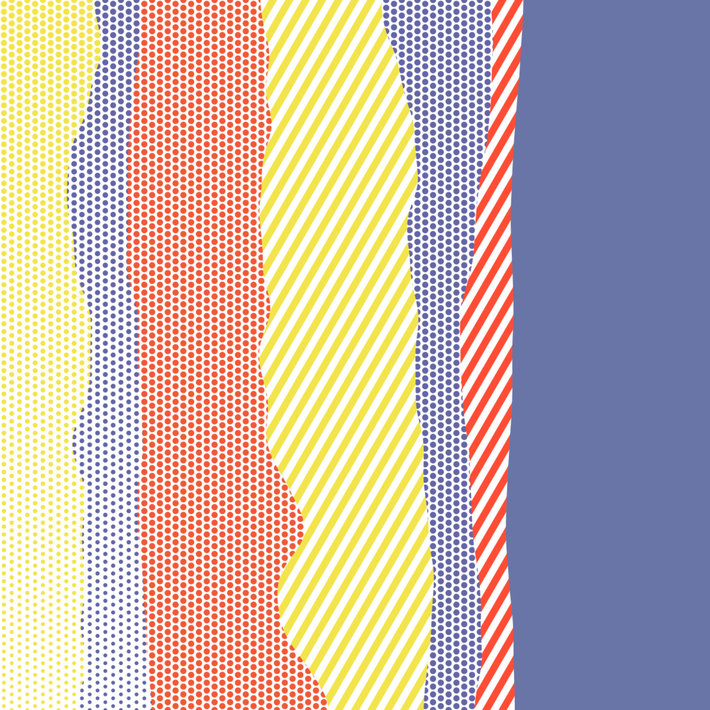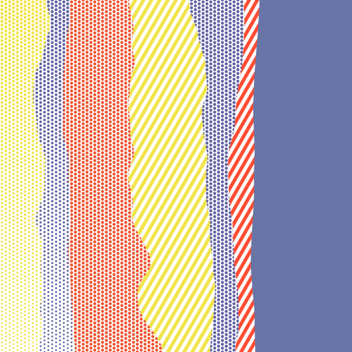 An ode to Roy Lichtenstein, incorporating his iconic version of Ben-Day dots, halftone dots, angled stripes, and solid color patches. Inspired by Roy's sea and landscape paintings, each artwork generates a unique combination of patterns, shapes, and colors.