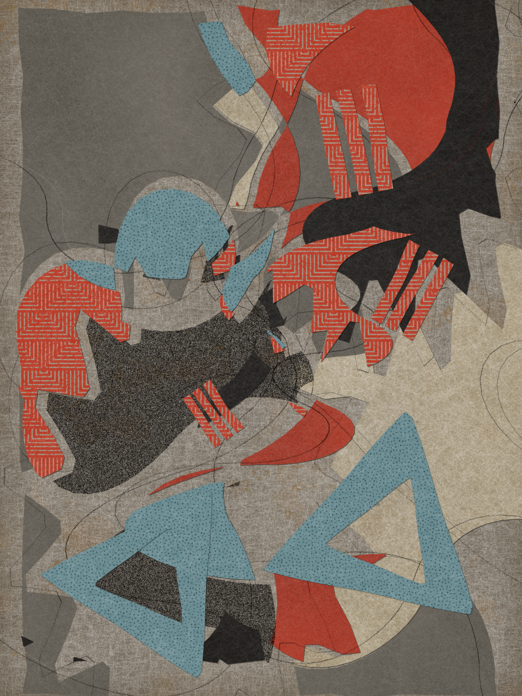 Much like the practice of collage itself, *Off Script* elicits a deeply sensorial experience. Generative textures induce a sense of tactility, while askew jagged shapes evoke the punctuated off-beat sounds of jazz. With its synesthetic qualities, the series challenges its own medium, creating a dialogue between the immateriality of digital representation and the corporality of the physical realm.