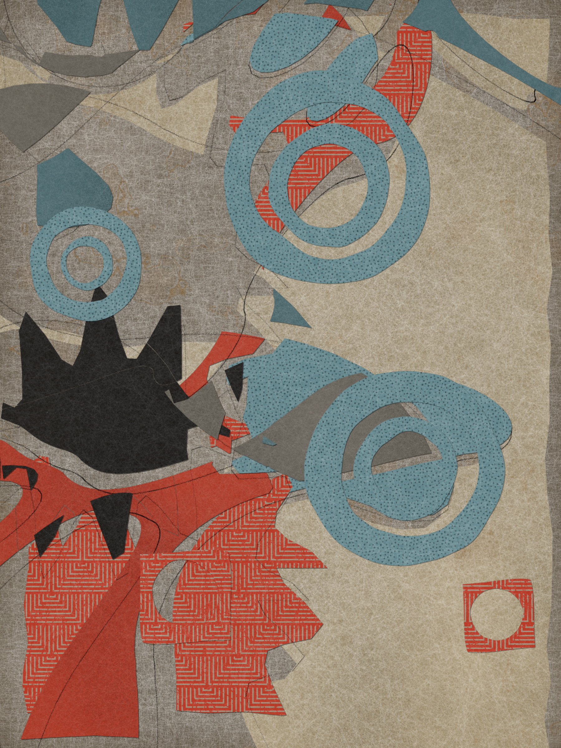 Much like the practice of collage itself, *Off Script* elicits a deeply sensorial experience. Generative textures induce a sense of tactility, while askew jagged shapes evoke the punctuated off-beat sounds of jazz. With its synesthetic qualities, the series challenges its own medium, creating a dialogue between the immateriality of digital representation and the corporality of the physical realm.