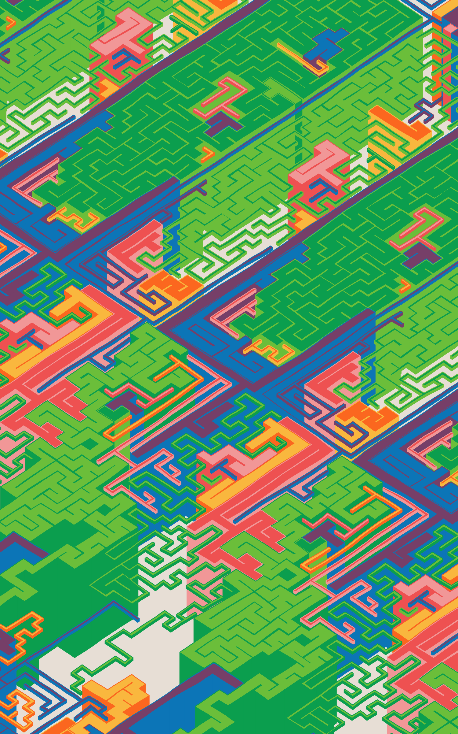 This project explores the visual expression of various planar symmetries by using colourful, maze-like structures. The precision of these mathematical patterns are offset by a playful use of dimensionality and an imperfect grid as basis for the linework.
