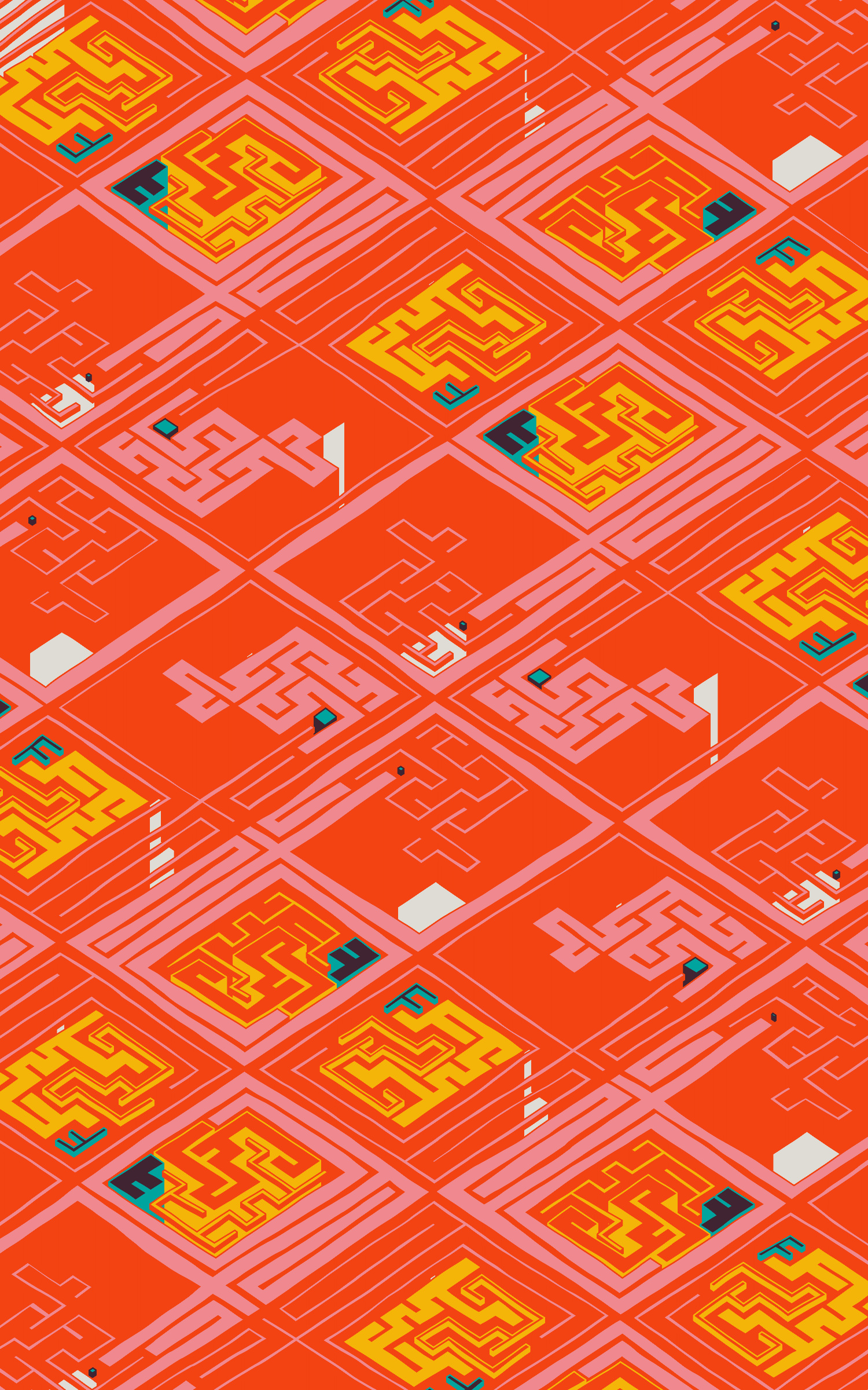 This project explores the visual expression of various planar symmetries by using colourful, maze-like structures. The precision of these mathematical patterns are offset by a playful use of dimensionality and an imperfect grid as basis for the linework.