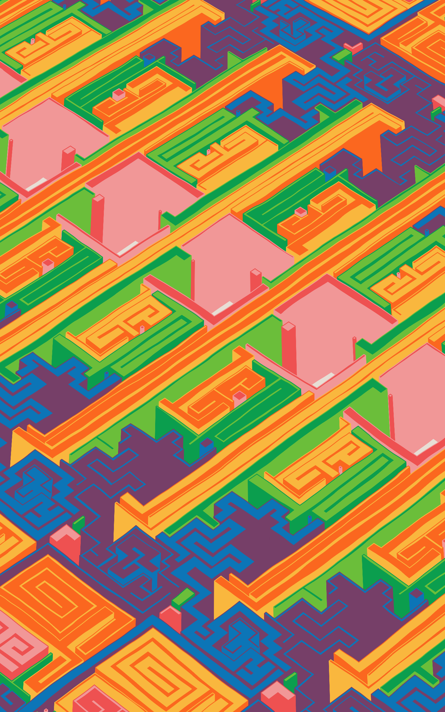 This project explores the visual expression of various planar symmetries by using colourful, maze-like structures. The precision of these mathematical patterns are offset by a playful use of dimensionality and an imperfect grid as basis for the linework.