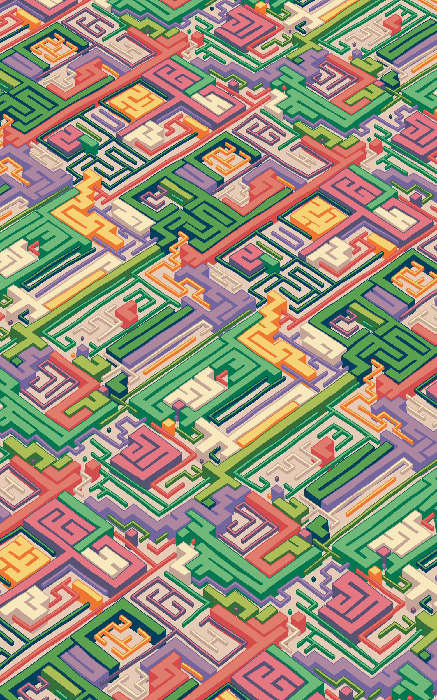 This project explores the visual expression of various planar symmetries by using colourful, maze-like structures. The precision of these mathematical patterns are offset by a playful use of dimensionality and an imperfect grid as basis for the linework.