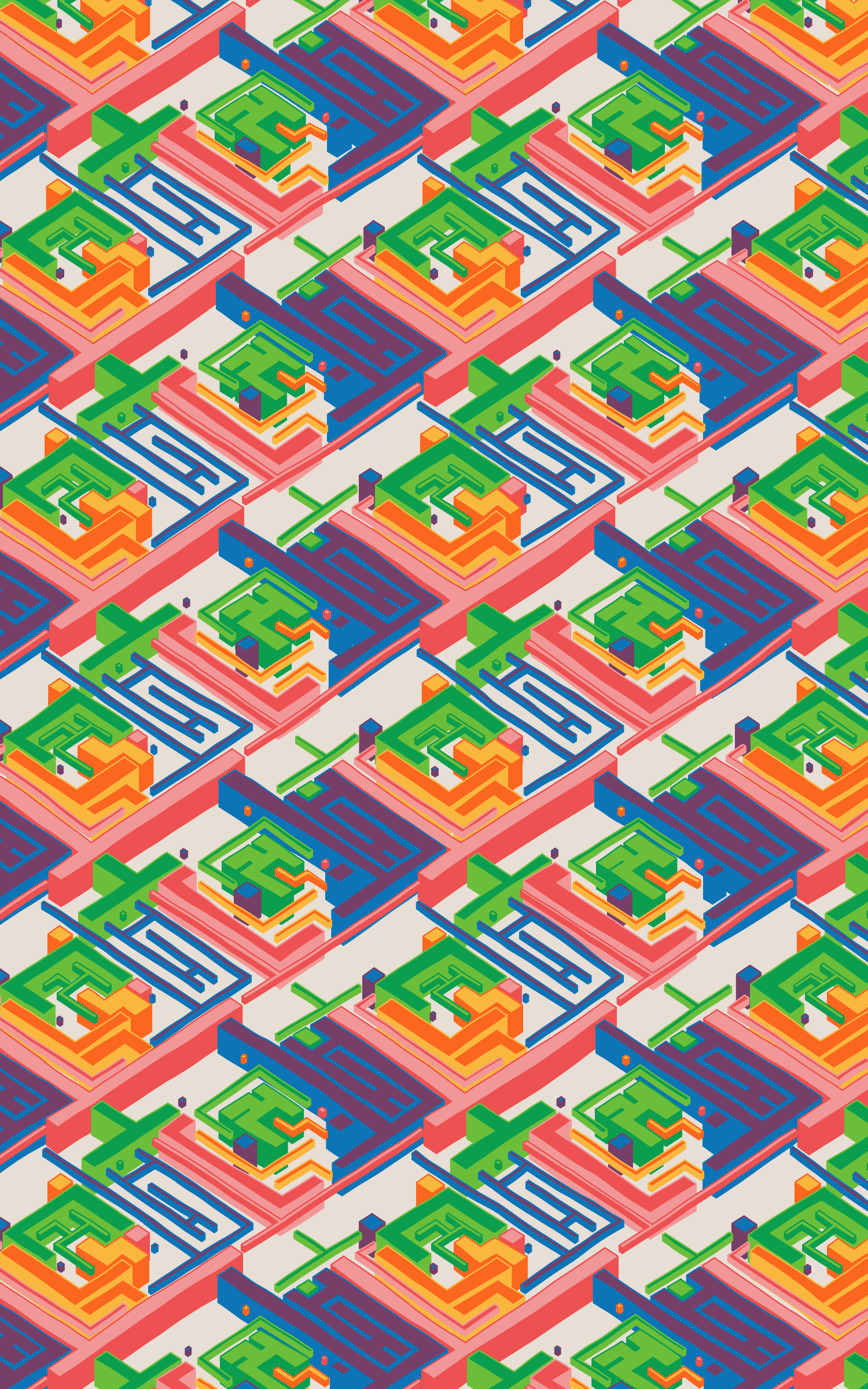 This project explores the visual expression of various planar symmetries by using colourful, maze-like structures. The precision of these mathematical patterns are offset by a playful use of dimensionality and an imperfect grid as basis for the linework.