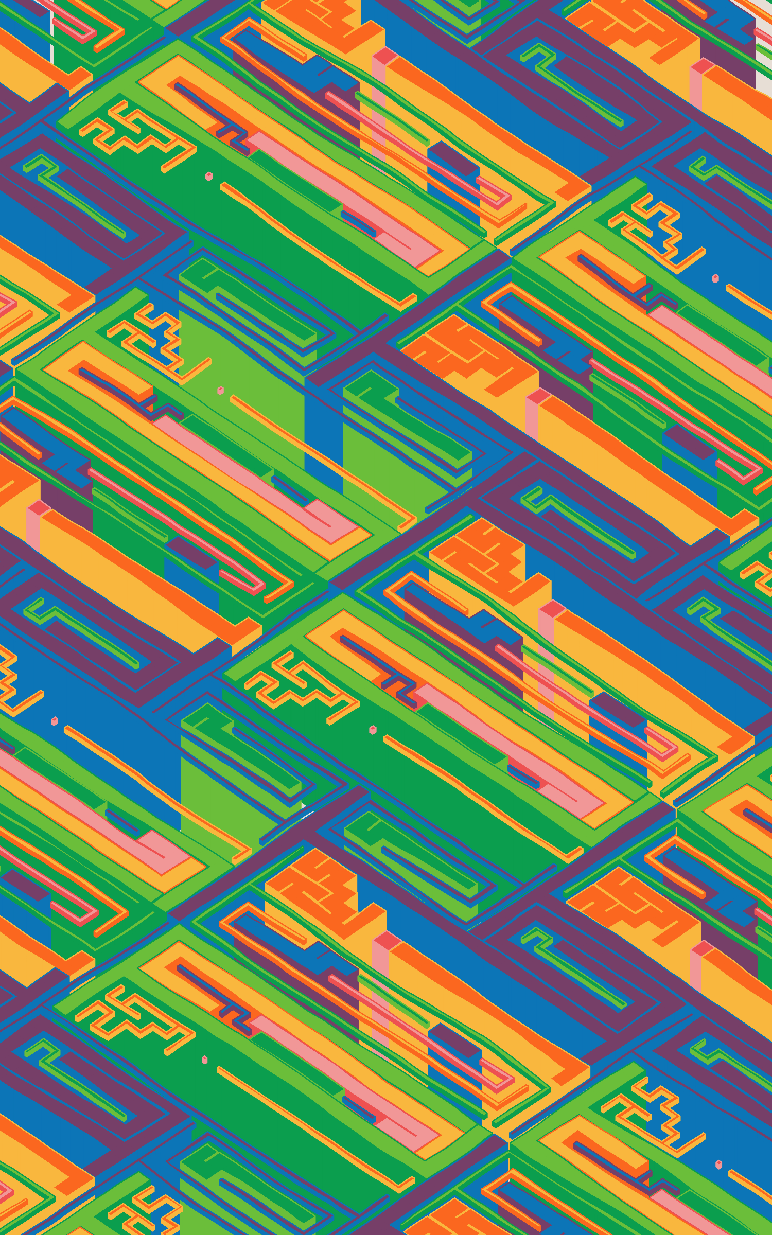 This project explores the visual expression of various planar symmetries by using colourful, maze-like structures. The precision of these mathematical patterns are offset by a playful use of dimensionality and an imperfect grid as basis for the linework.