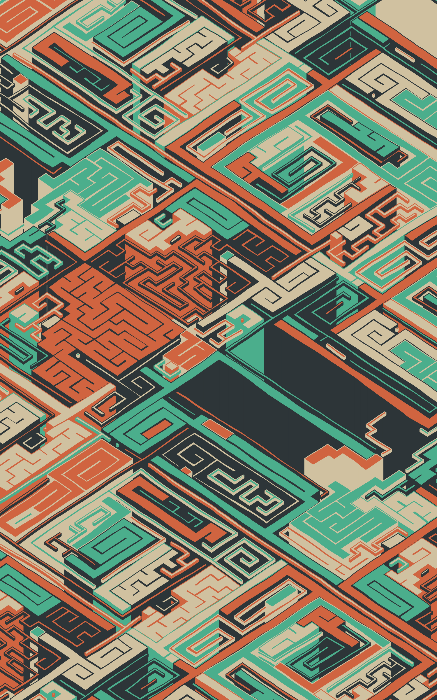 This project explores the visual expression of various planar symmetries by using colourful, maze-like structures. The precision of these mathematical patterns are offset by a playful use of dimensionality and an imperfect grid as basis for the linework.