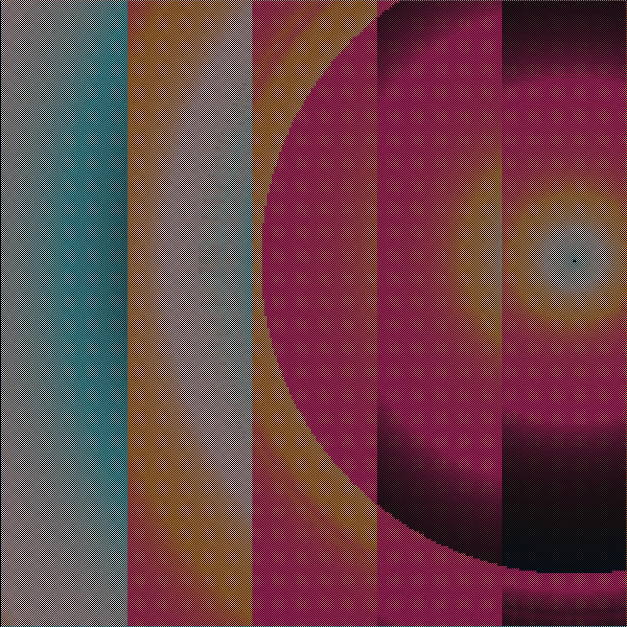 This project is a visual representation of realities that are out of phase. Interference patterns, colorful echoes, and emerging secrets are explored. Mathematical functions produce constant motion, but rarely, a peaceful scene resolves within the chaos. Click or press any key to pause. *Photosensitive seizure warning: These artworks contain flashing colors and moving patterns.