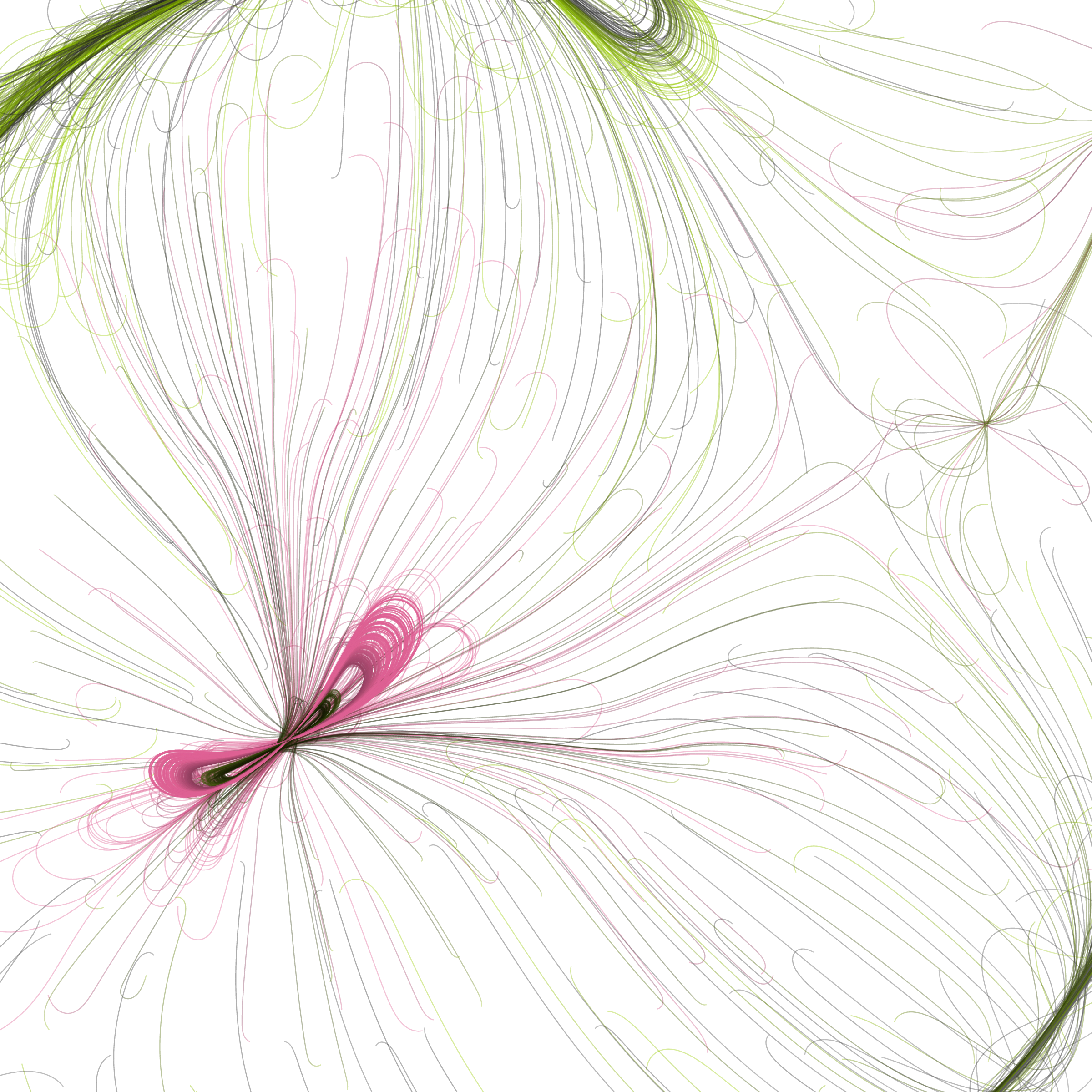 “Phototaxis” is a simulated environment populated by simple machines. After Valentino Braitenberg’s 1984 book “Vehicles,” there are four kinds of machines with different wiring and behaviors: Explorers, Aggressors, Lovers, and Cowards. Each line charts the history of one machine’s movement. The core of this code was the foundation for my MicroImage series of works dating back to 2001. I’ve worked on it in fits and starts since then, and in 2021 it was further developed for Art Blocks. Press ‘P’ to play/pause, ‘B’ for the big bang, ‘1’–’5’ to change the magnification, and ‘L’ to reveal the lights’ locations.