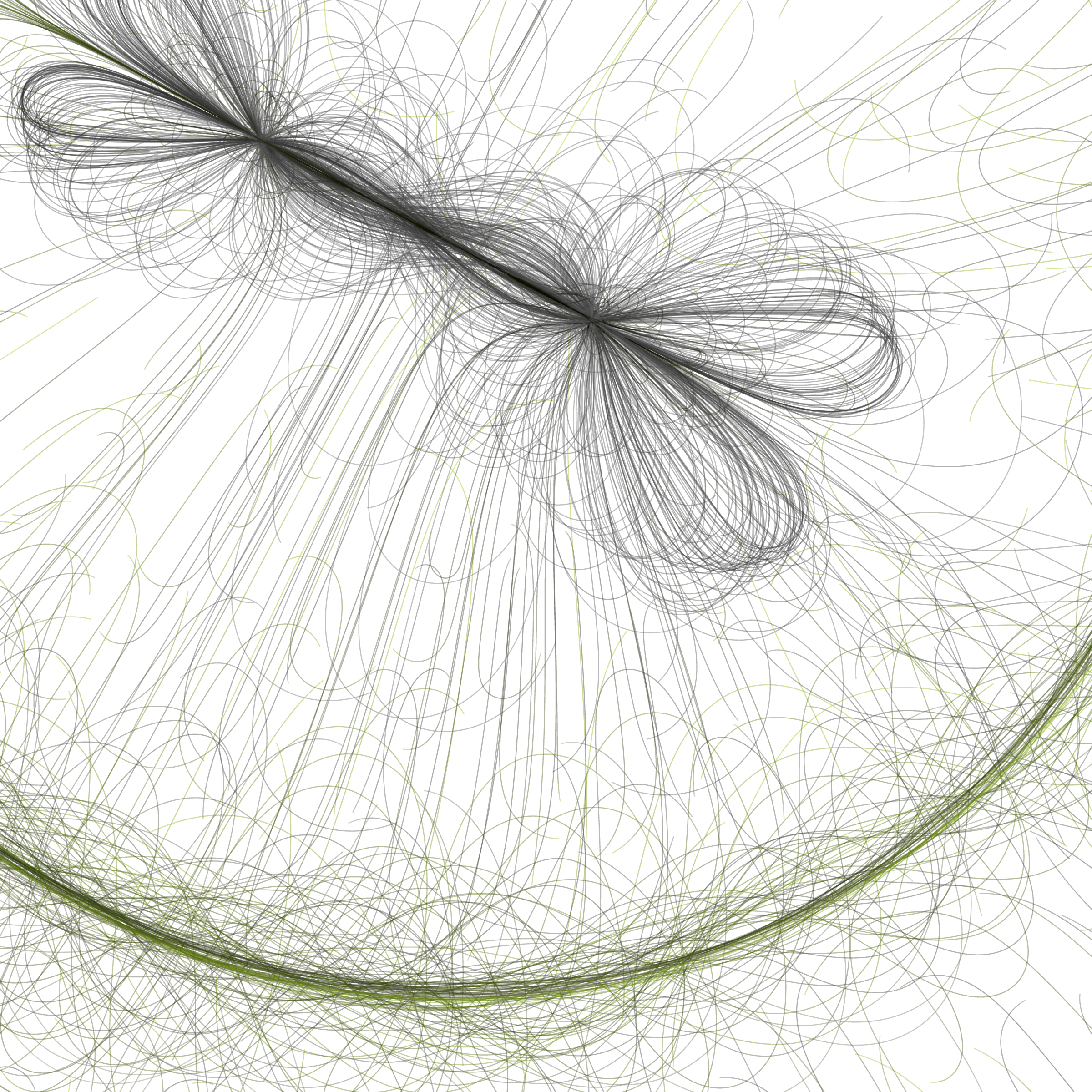 “Phototaxis” is a simulated environment populated by simple machines. After Valentino Braitenberg’s 1984 book “Vehicles,” there are four kinds of machines with different wiring and behaviors: Explorers, Aggressors, Lovers, and Cowards. Each line charts the history of one machine’s movement. The core of this code was the foundation for my MicroImage series of works dating back to 2001. I’ve worked on it in fits and starts since then, and in 2021 it was further developed for Art Blocks. Press ‘P’ to play/pause, ‘B’ for the big bang, ‘1’–’5’ to change the magnification, and ‘L’ to reveal the lights’ locations.