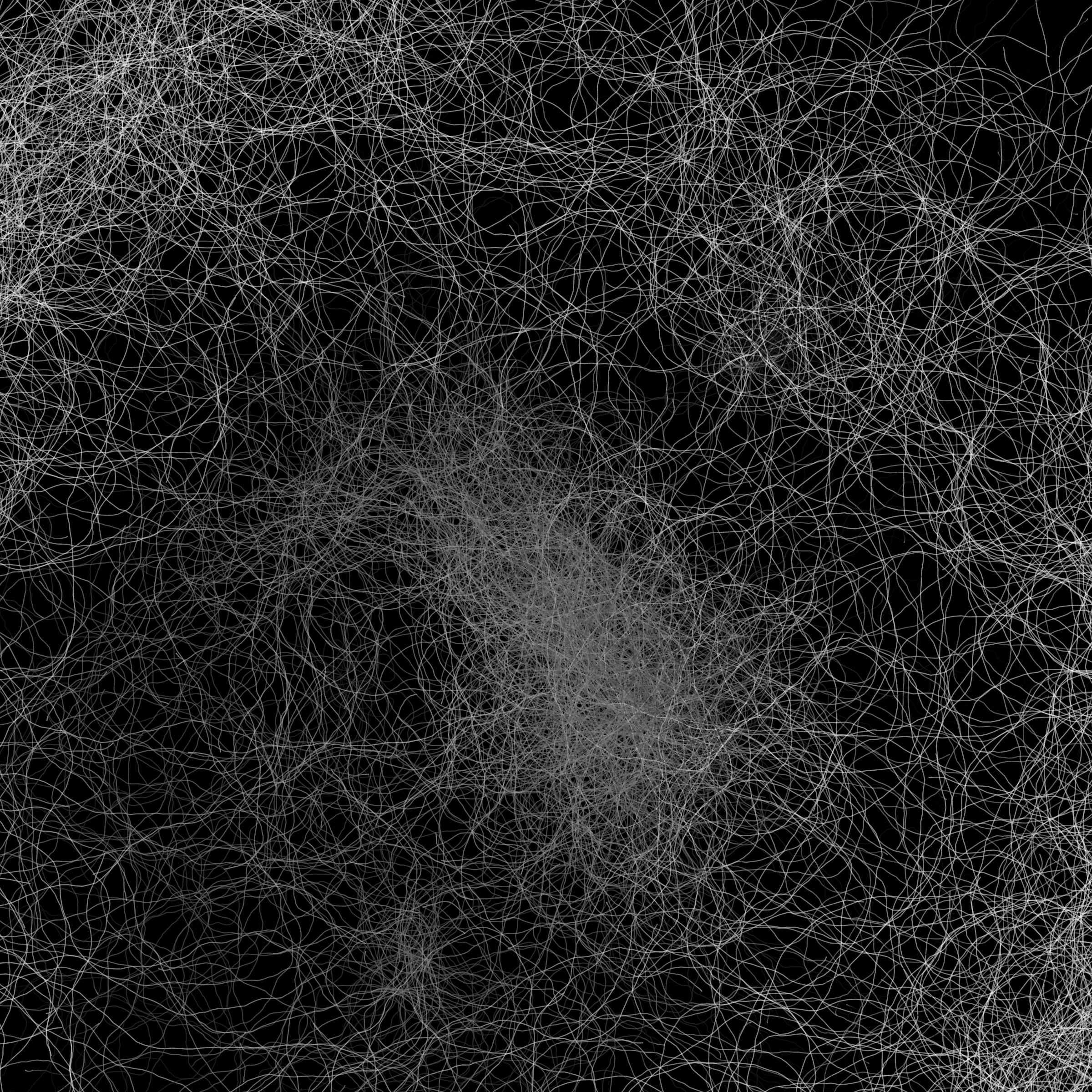 “Phototaxis” is a simulated environment populated by simple machines. After Valentino Braitenberg’s 1984 book “Vehicles,” there are four kinds of machines with different wiring and behaviors: Explorers, Aggressors, Lovers, and Cowards. Each line charts the history of one machine’s movement. The core of this code was the foundation for my MicroImage series of works dating back to 2001. I’ve worked on it in fits and starts since then, and in 2021 it was further developed for Art Blocks. Press ‘P’ to play/pause, ‘B’ for the big bang, ‘1’–’5’ to change the magnification, and ‘L’ to reveal the lights’ locations.