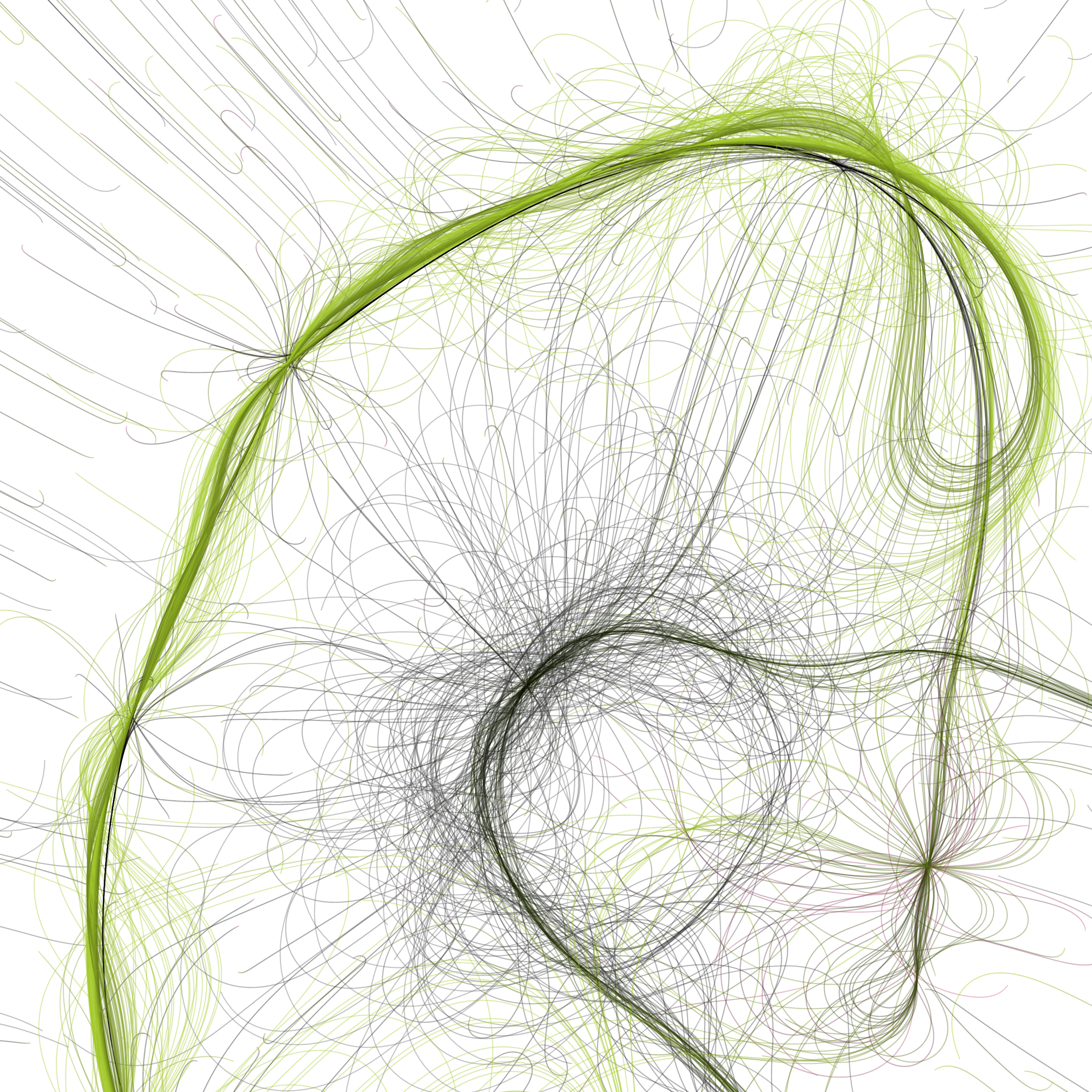“Phototaxis” is a simulated environment populated by simple machines. After Valentino Braitenberg’s 1984 book “Vehicles,” there are four kinds of machines with different wiring and behaviors: Explorers, Aggressors, Lovers, and Cowards. Each line charts the history of one machine’s movement. The core of this code was the foundation for my MicroImage series of works dating back to 2001. I’ve worked on it in fits and starts since then, and in 2021 it was further developed for Art Blocks. Press ‘P’ to play/pause, ‘B’ for the big bang, ‘1’–’5’ to change the magnification, and ‘L’ to reveal the lights’ locations.