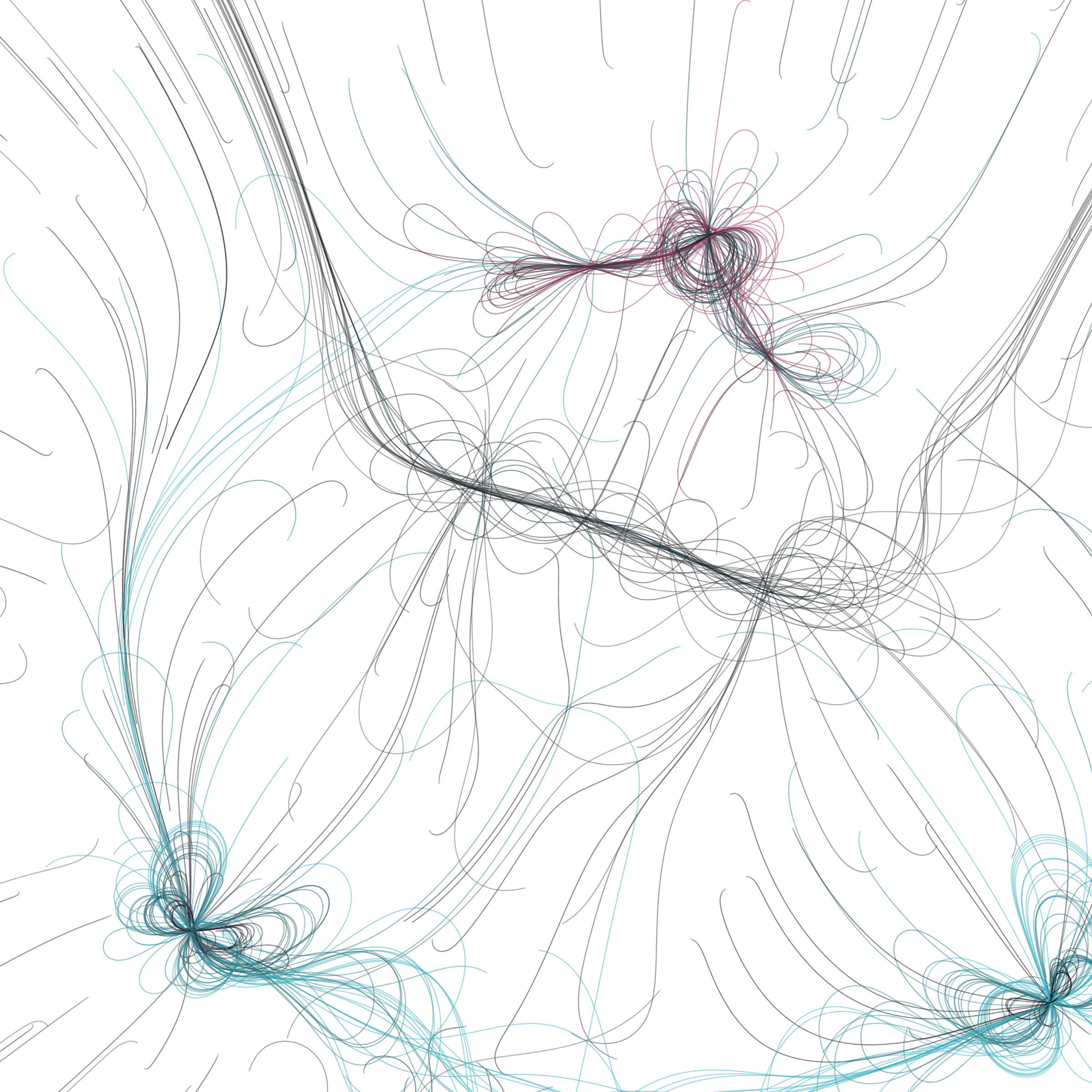“Phototaxis” is a simulated environment populated by simple machines. After Valentino Braitenberg’s 1984 book “Vehicles,” there are four kinds of machines with different wiring and behaviors: Explorers, Aggressors, Lovers, and Cowards. Each line charts the history of one machine’s movement. The core of this code was the foundation for my MicroImage series of works dating back to 2001. I’ve worked on it in fits and starts since then, and in 2021 it was further developed for Art Blocks. Press ‘P’ to play/pause, ‘B’ for the big bang, ‘1’–’5’ to change the magnification, and ‘L’ to reveal the lights’ locations.